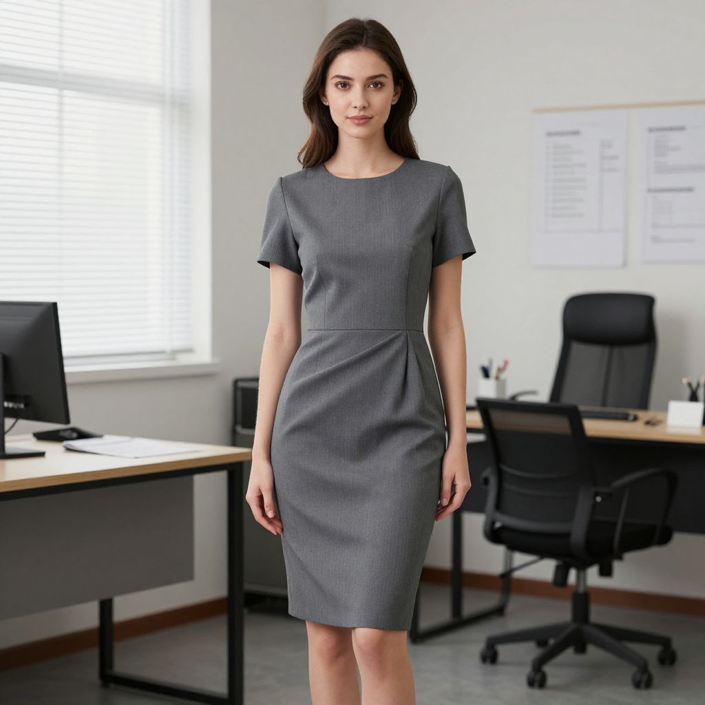 Office Wear Frocks Woman Costume, a woman in a gray dress standing in a room