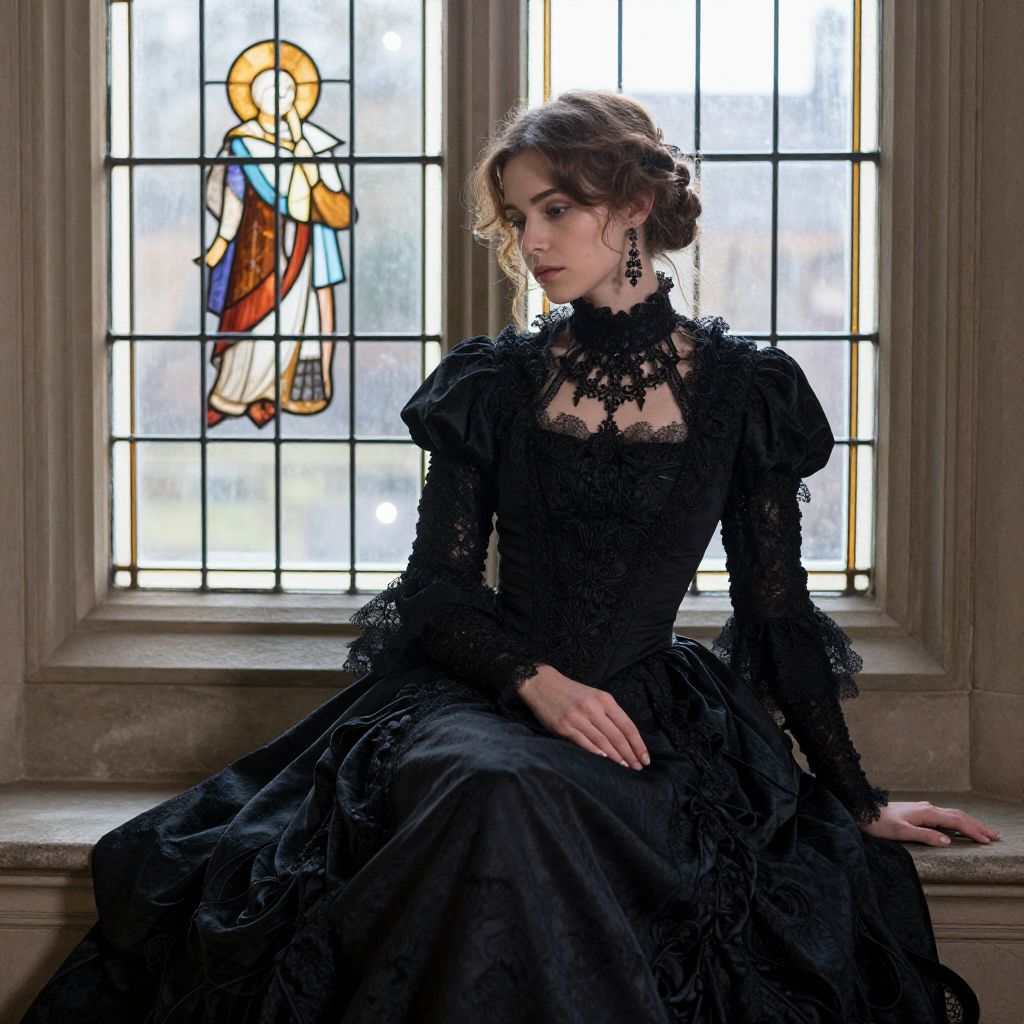 Photograph of a young woman with pale skin and curly brown hair, styled in an updo with loose strands framing her face. She wears a black, Victorian-style gown with intricate lace detailing, puffed sleeves, and a high neckline. She sits on a stone windowsill, gazing to her left. The background features a stained glass window with a colorful depiction of a robed figure, possibly a saint, set against a white light. The woman's expression is pensive, and she wears small, dangling earrings. The scene is lit by natural light from the window, highlighting the textures of her dress and the stone sill.