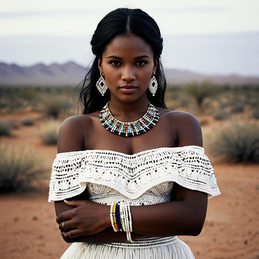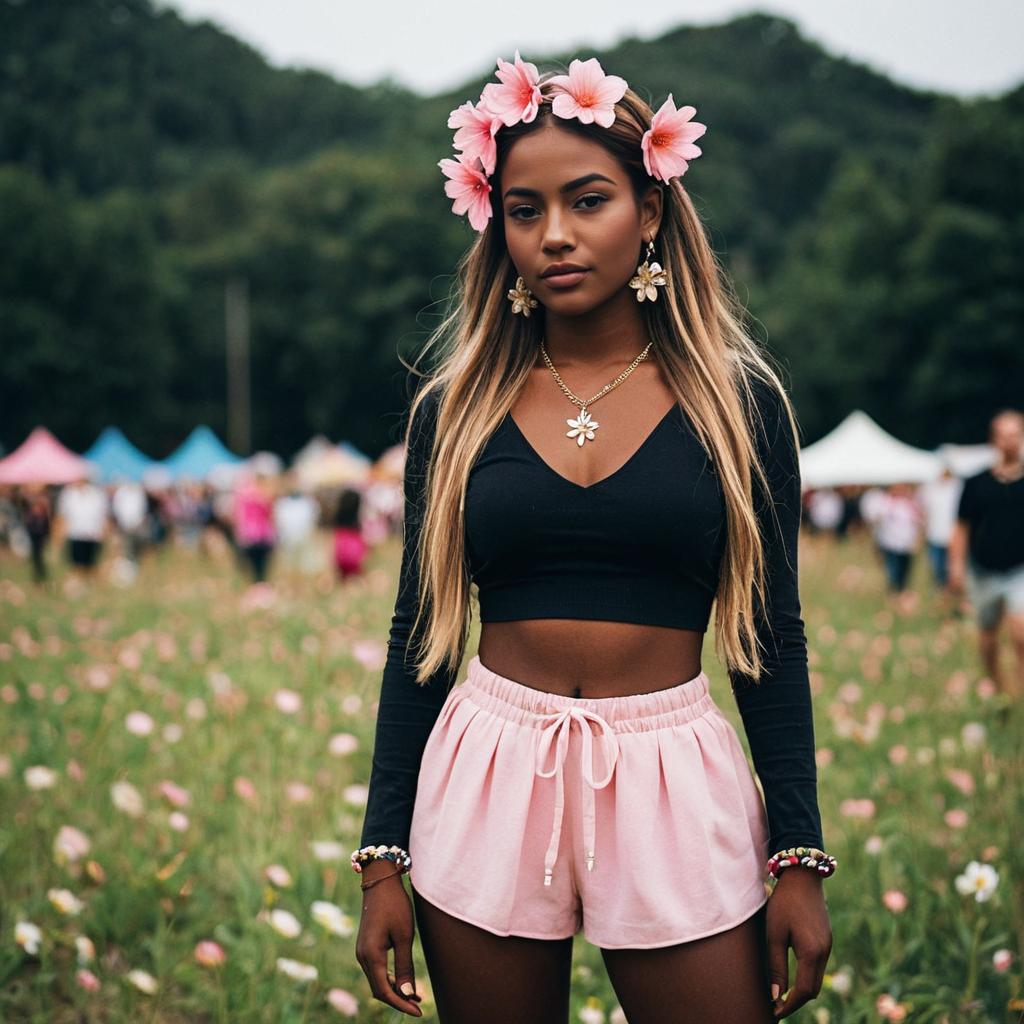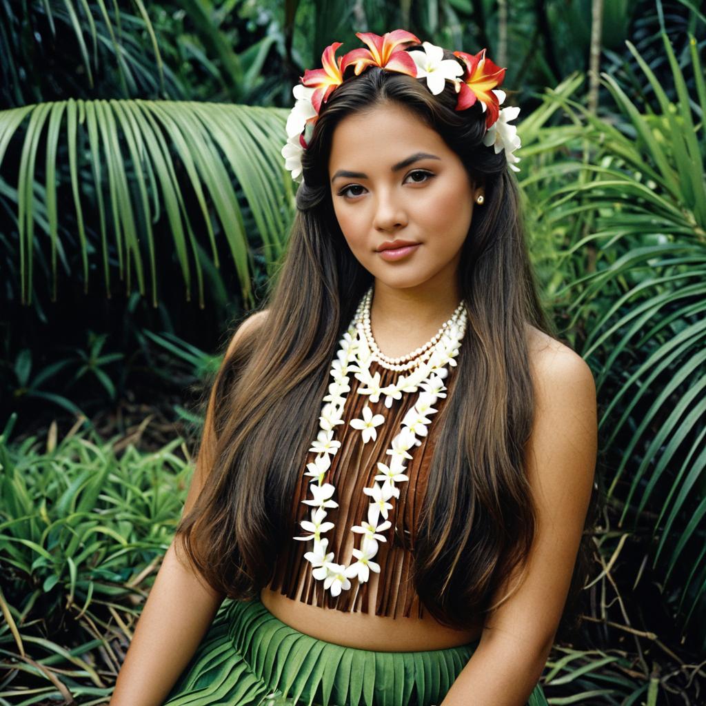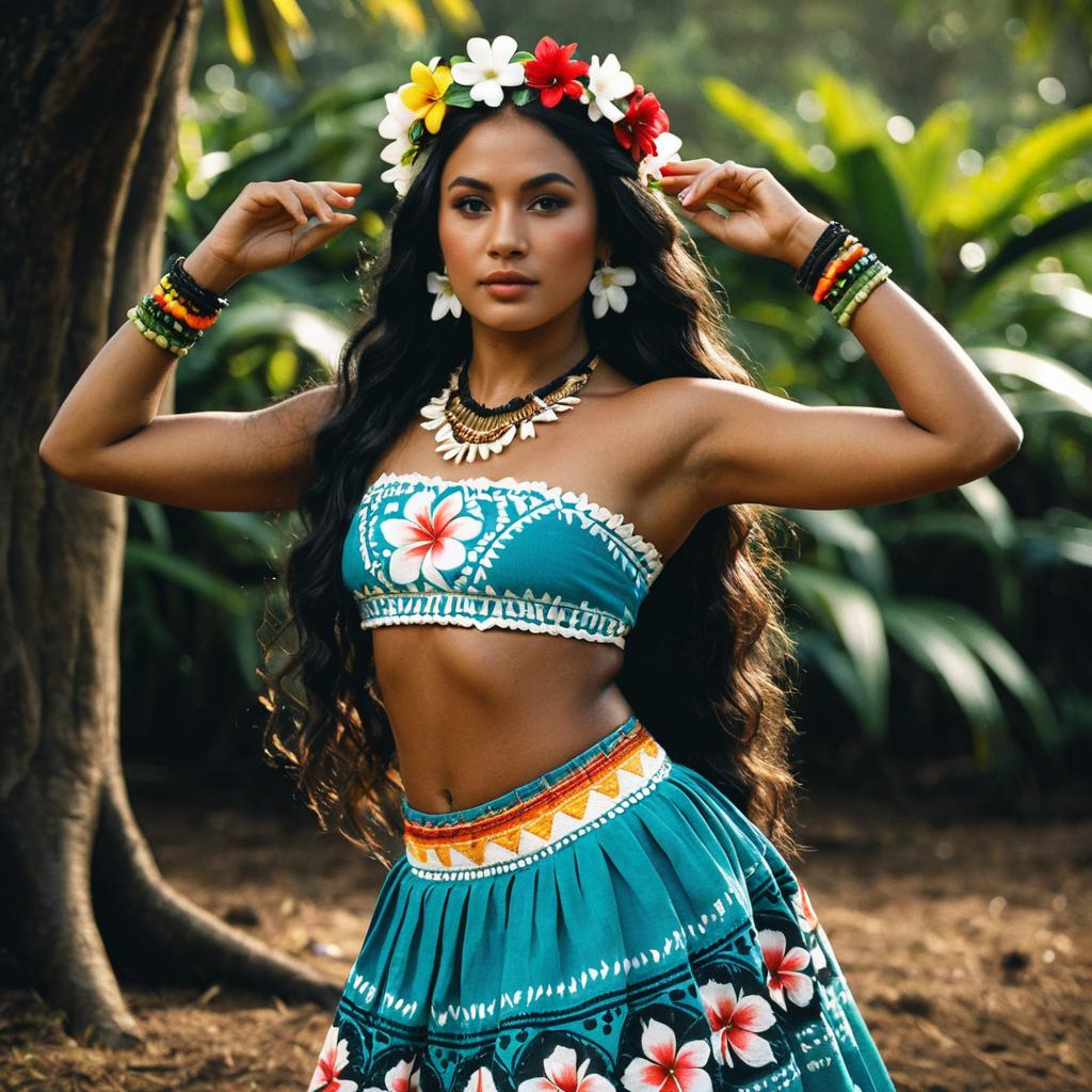 Tiki party costume,1girl, jewelry, solo, hair ornament, flower, hair flower, bracelet, necklace, skirt, earrings, black hair, long hair, bare shoulders, dark-skinned female, looking at viewer, outdoors, crop top, lips, dark skin, midriff