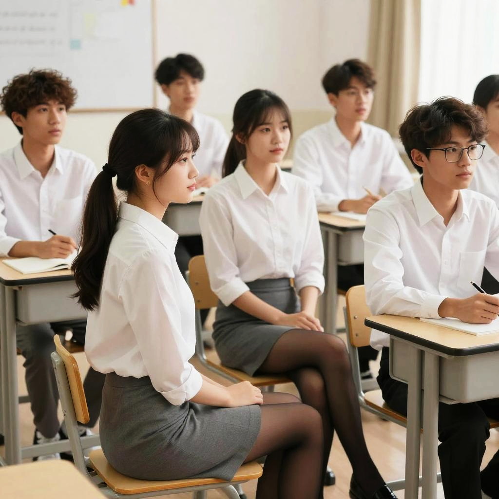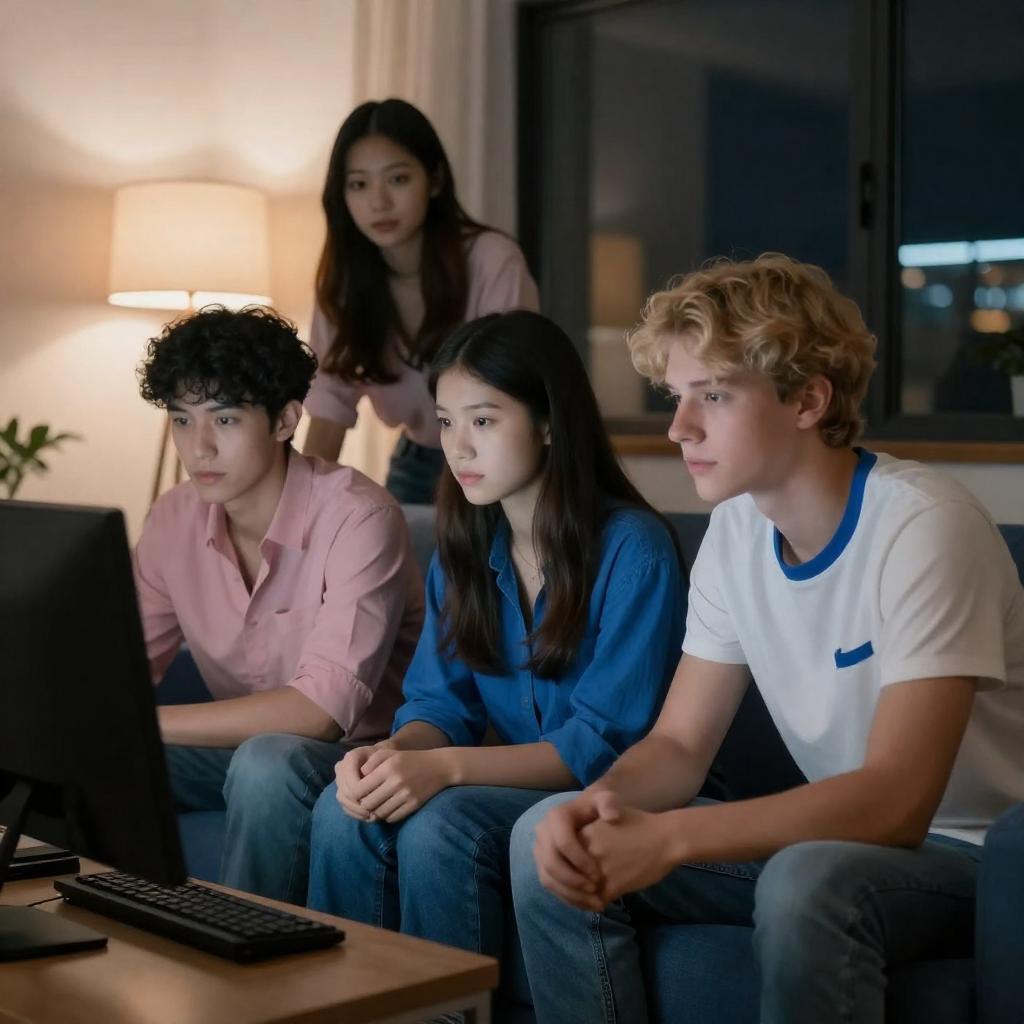 A diverse group of four young adults sitting outdoors near modern glass buildings, engaged in looking at a laptop together, casual clothing, natural daylight, green trees and plants in the background, cheerful and collaborative mood