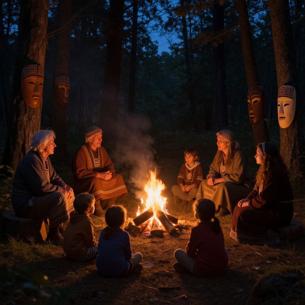 Salish gathering around a fire in a dense forest at twilight, storytelling scene with elders and children, glowing firelight illuminating carved masks and ceremonial attire, serene and spiritual atmosphere, high detail digital painting with rich textures