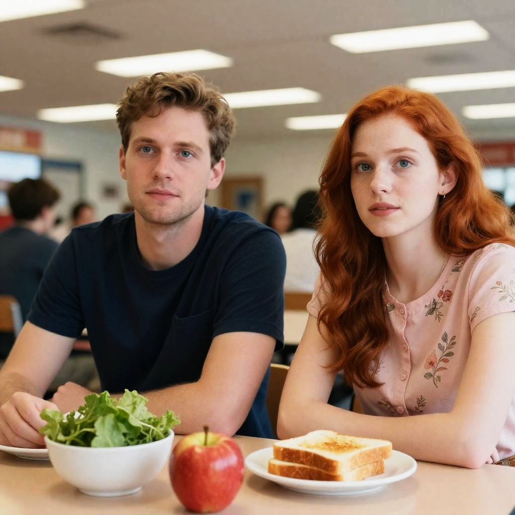 Photograph of a man and woman sitting at a cafeteria table. Man with short brown hair, blue eyes, wearing navy shirt. Woman with red hair, blue eyes, wearing pink floral shirt. Both looking forward. Table has bowl with green leaf, red apple, and plate with toast. Background has fluorescent lights and other seated people.