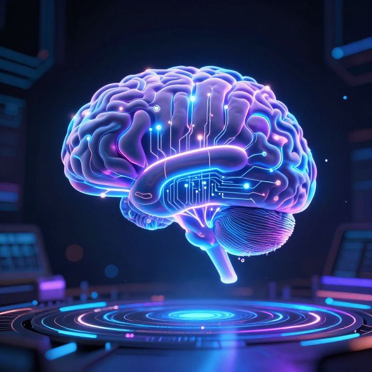 AI a picture of a futuristic digital brain composed of glowing circuits and neural networks, floating above a sleek, holographic interface in a dark cybernetic environment, vibrant blue and purple color scheme, ultra detailed, high resolution.