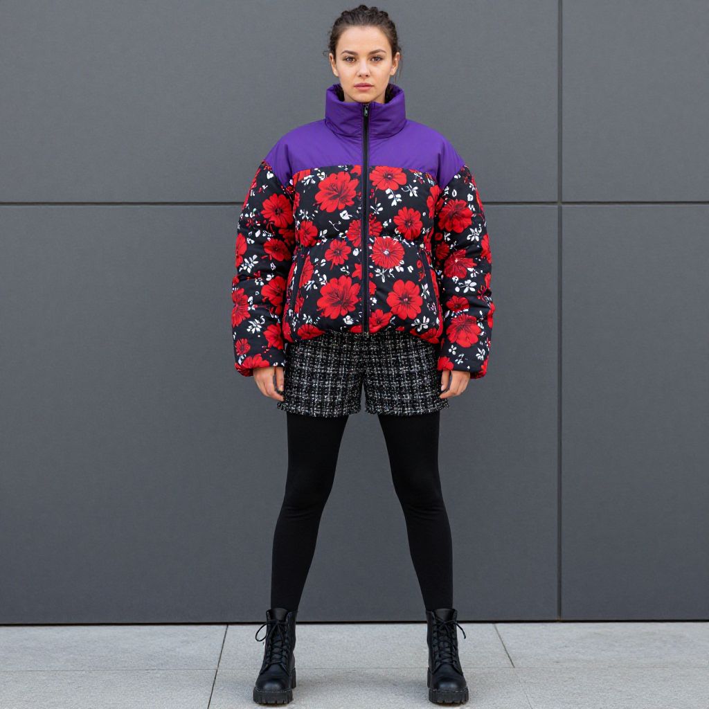 "Woman, streetwear, oversized multicolor floral print puffer jacket in red and black, purple panel, high-neck, zip front, tweed shorts in black and white, mid-thigh length, textured fabric, black activewear leggings underneath, black lace-up ankle boots with thick soles, no visible jewelry, natural makeup, braided hair pulled back, plain white. Sexy. Pretty face and beаutiful eyes. Big breasts."