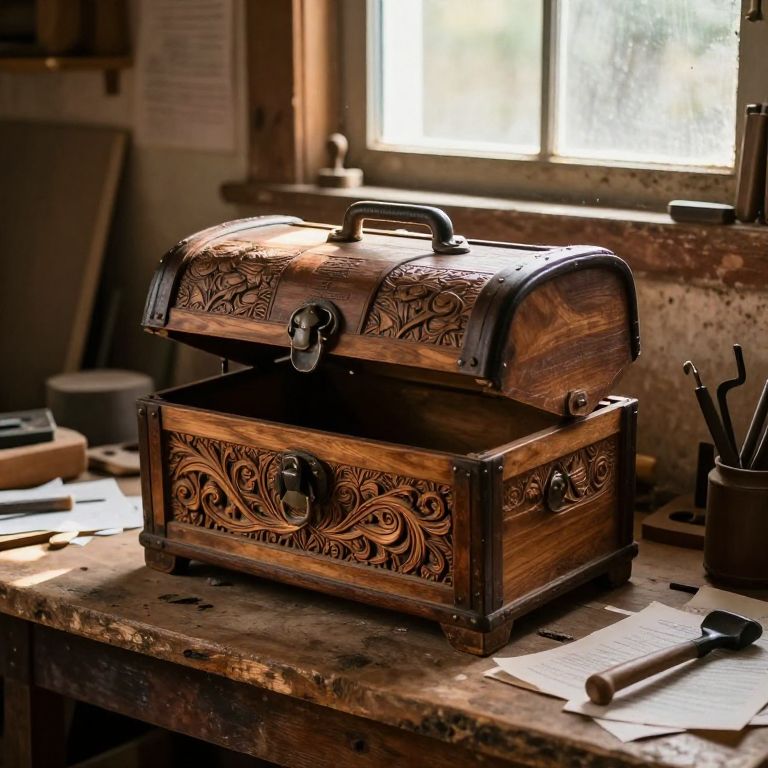 Caja in a rustic wooden workshop, surrounded by tools and scattered papers, warm sunlight streaming through a dusty window, highlighting the intricate carvings on the caja, vintage style, detailed textures, cozy atmosphere.