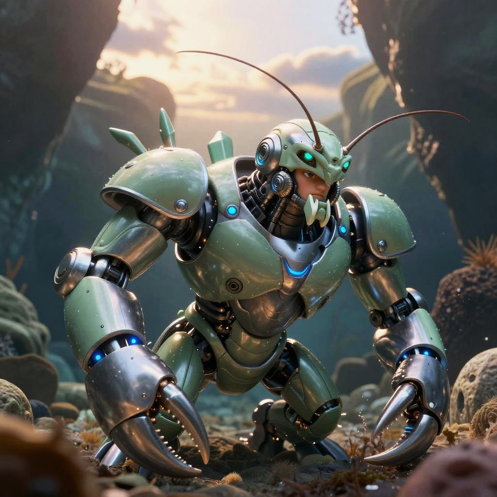 Chest-up bust shot of an anthropomorphic humanoid male robotic mantis shrimp, looking to the side, chrome and seafoam green segmented armor, powerful claw-like pincers and sharp teeth, bioluminescent blue LEDs, lurking in underwater caves at dusk, high quality, cinematic art, sunset lighting, 3D render, 8k, artstation, deviantart, furaffinity