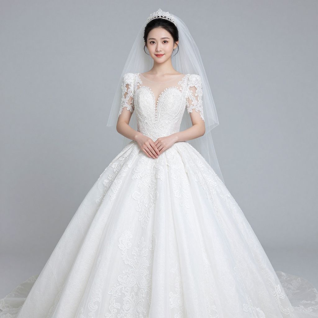 Princess Sleeve Wedding Dress, a woman in a wedding dress and veil posing for a picture