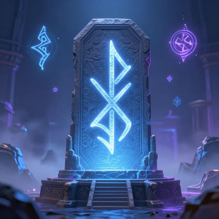 CGI image of a glowing blue, ancient stone throne with intricate patterns and a large, neon symbol, surrounded by floating, ethereal runes in a