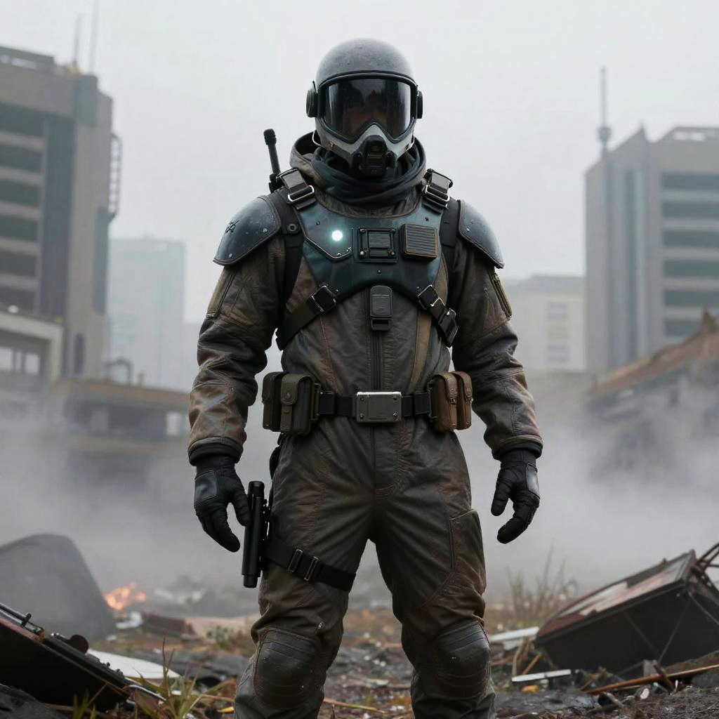 Hazmat suit soldier standing in a post-apocalyptic cityscape, foggy atmosphere, detailed protective gear with glowing visor, dystopian background, cinematic lighting