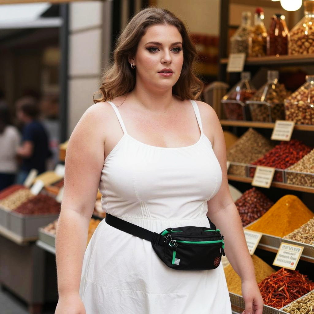 A Plus-size woman in a casual urban style, wearing a white sundress with thin straps and a fitted bodice, complemented by a black and green fanny pack at her waist, stands in a vibrant street market spice shop, captured in the visual style of Gottfried Helnwein. Sexy. Pretty face and beаutiful eyes. Big breasts