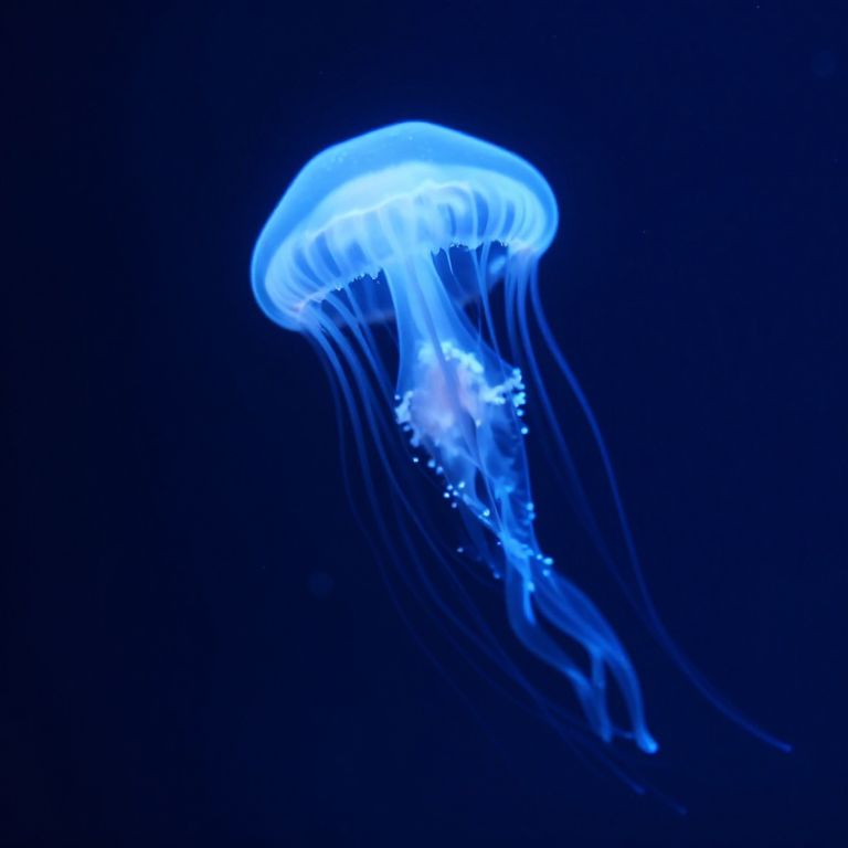 Glowing translucent jellyfish drifts gracefully through the deep blue ocean, its ethereal body illuminated by pulsating bioluminescence, casting a serene glow against the dark backdrop.
