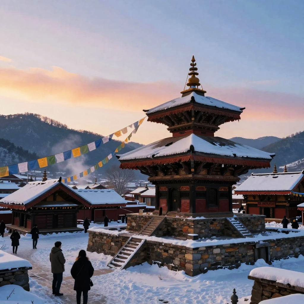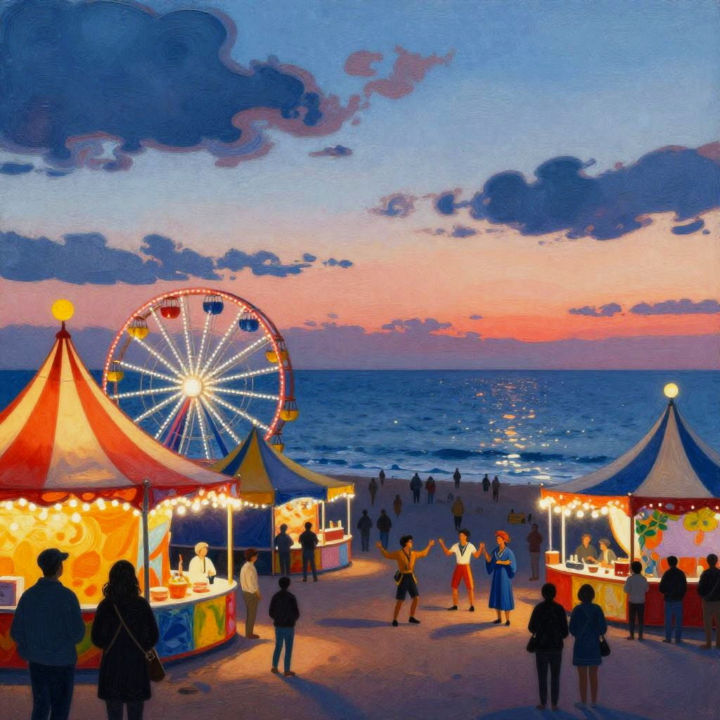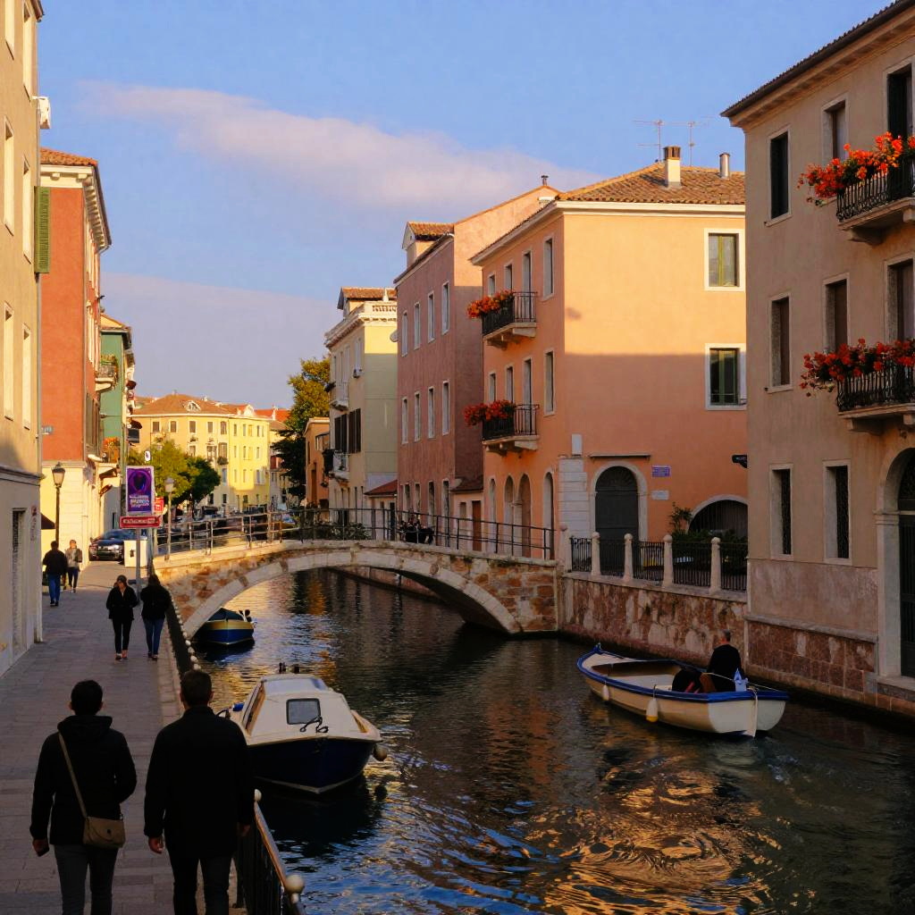 A serene urban canal scene at sunrise featuring moored gondolas and an arched bridge. The water reflects the warm colors of the colorful sky, enhanced by trailing willow branches hanging over the canal. Traditional European-style buildings line the canal, with silhouetted figures walking along the water's edge. The image captures a peaceful, vibrant atmosphere blending warm and cool tones in a modern artistic style.
