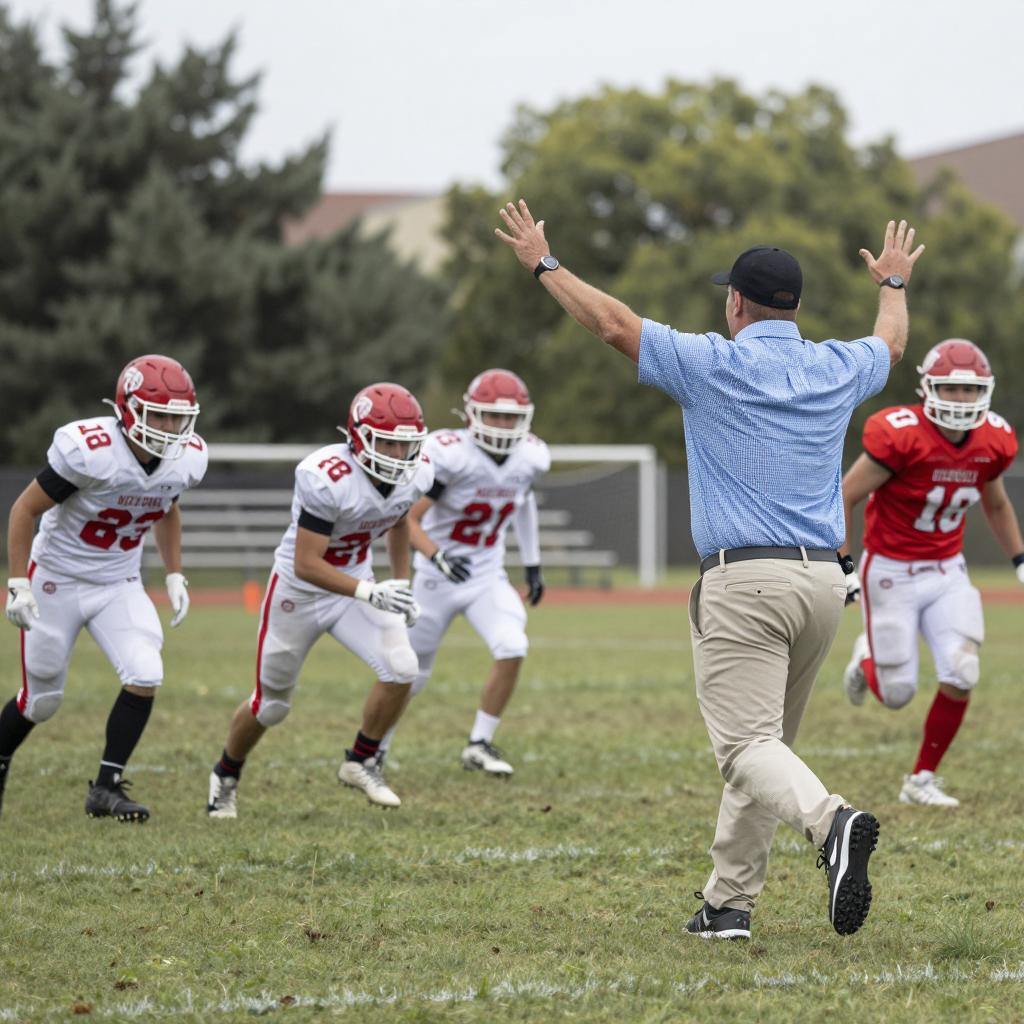 Photograph of a football game on a grass field. Male coach in blue checkered shirt and beige pants runs in foreground, arms raised. Five male players in white uniforms with red helmets and jerseys chase ball. One player in red jersey and white pants runs away. Trees and bleachers in background. Overcast sky.