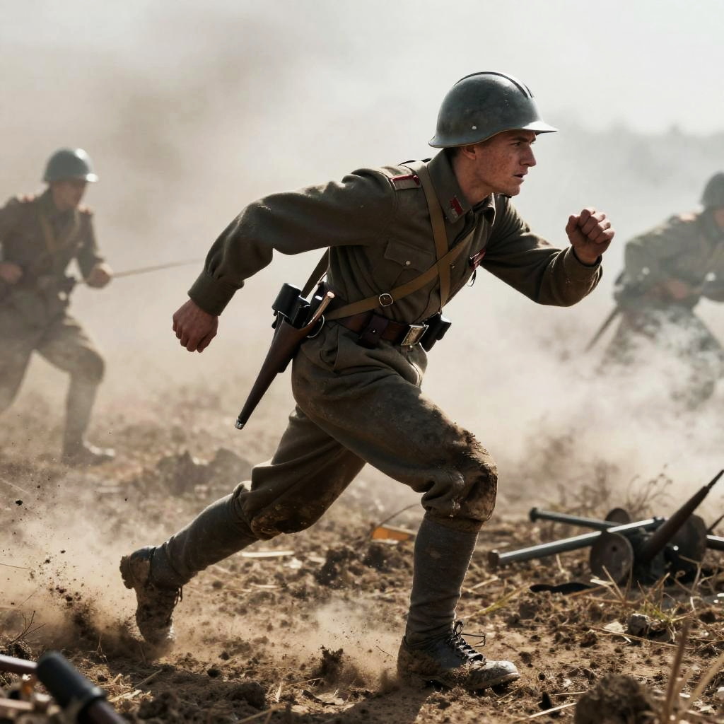Dynamic action scene with a soldier in an Austrian WW1 uniform charging through a smoky battlefield, muddy boots and torn fabric, expressive pose, dramatic backlight casting long shadows, muted color palette evoking early 20th century war photography