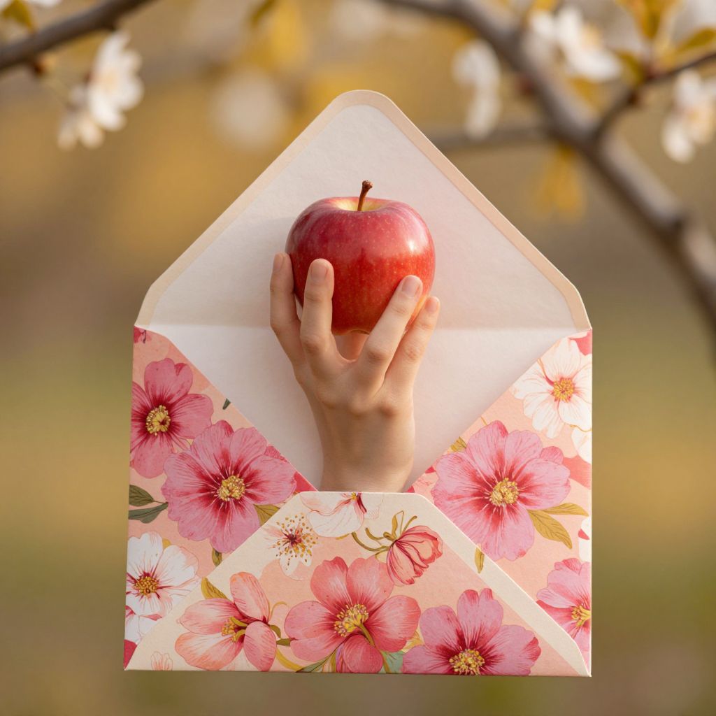 Photograph of a hand holding a red apple in a colorful floral envelope, set against a blurred spring background with white blossoms.