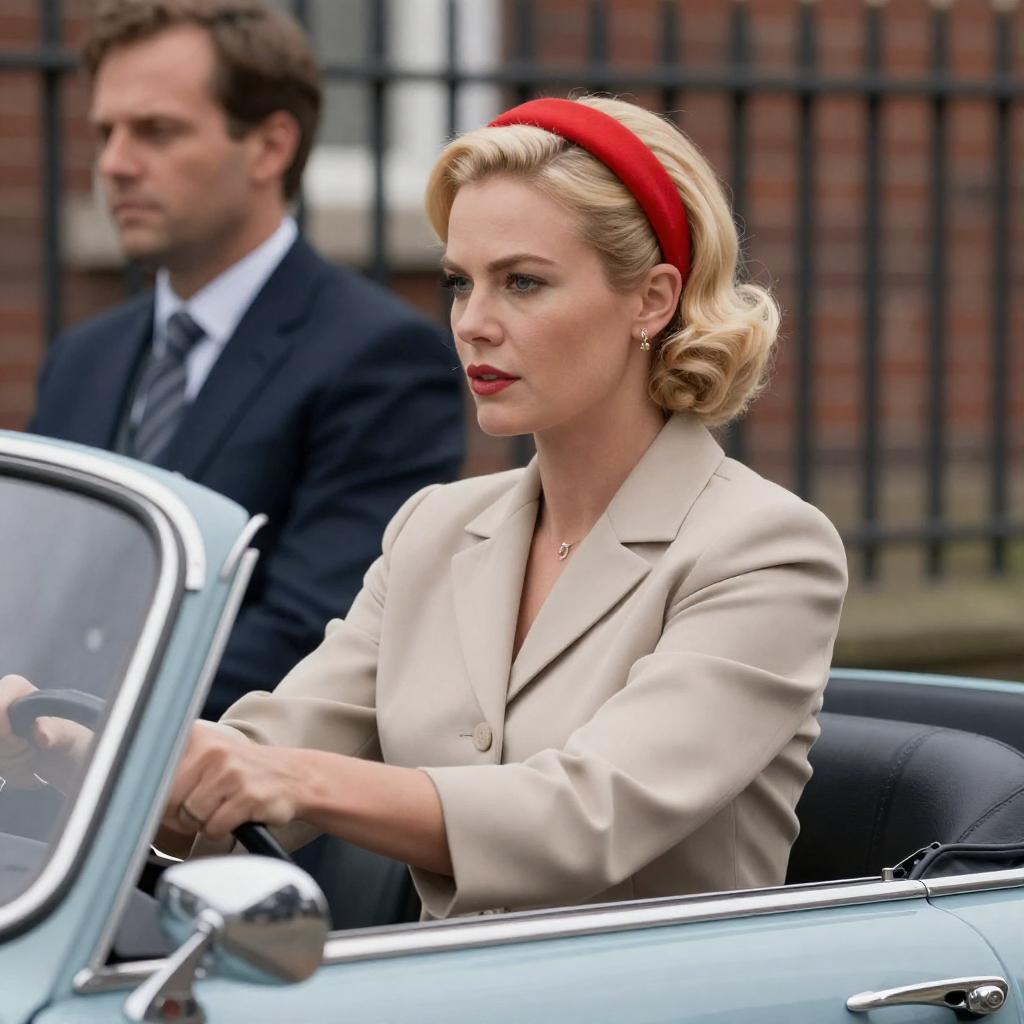 Photograph of a vintage scene: woman with red headband, white coat, driving white convertible, focused expression; man in dark suit, gray hat, aiming rifle from behind, intense expression, iron gate in background.