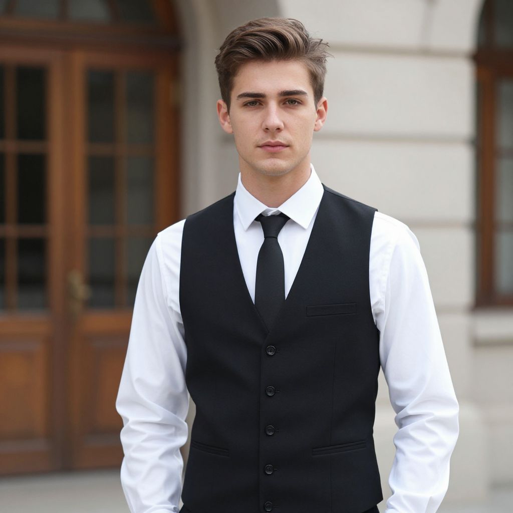Photograph of a young Caucasian man with short, neatly styled brown hair and fair skin, standing outdoors. He wears a crisp white dress shirt, a black vest with three buttons, and a black tie. He has a serious expression and is looking directly at the camera. The background features a white stone building with large wooden double doors and dark glass panes. The lighting is natural, highlighting the man's formal attire and the clean, elegant architectural elements.