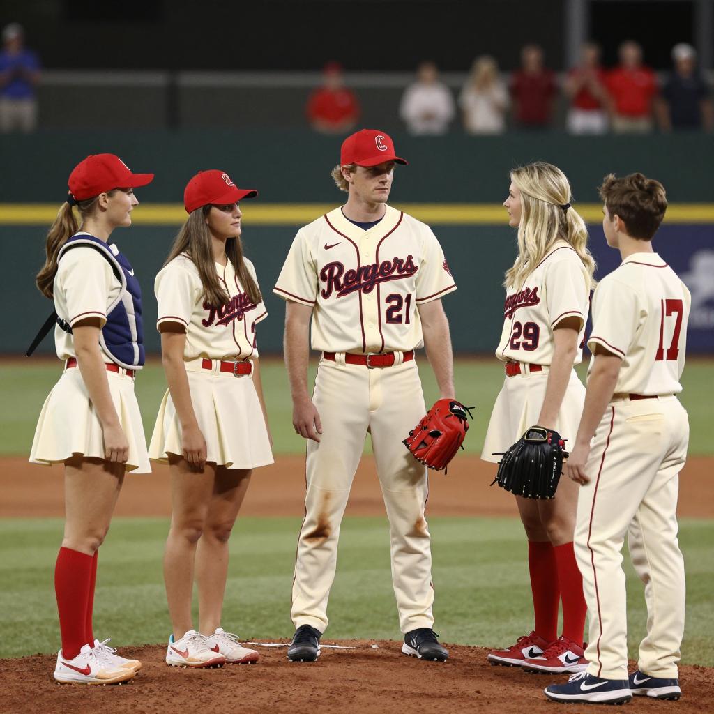 Four people on a baseball field at night. Central male in cream baseball uniform with red cap, red glove, and dark pants. Two females in cream dresses with red belts, one with red cap and chest protector, one with blonde hair. Young boy in cream uniform on right. Background: dark stadium, spectators. Central male looks at female with cap, others look at central male. Green grass, dirt path.