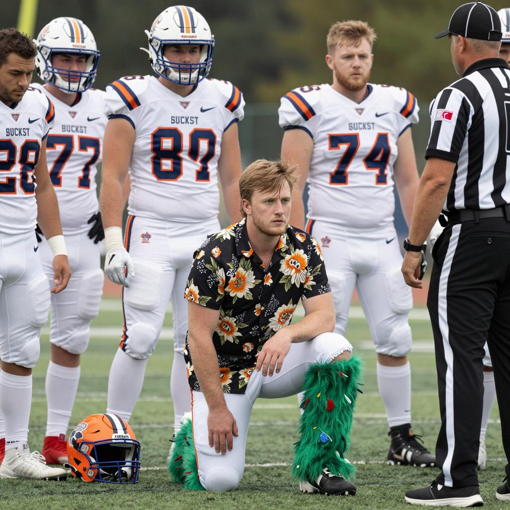 Five baseball players standing on a pitcher's mound in a stadium at night. The central male wears a cream uniform with red accents, red cap and glove, and black shoes. Two females in cream dresses with red belts and red socks stand on the left, one wearing a red cap and chest protector. Another female player with blonde hair, holding a black glove, stands to the right of the central male. A young boy in a cream baseball uniform with number 17 and dark Nike shoes stands on the far right. The background shows a blurred crowd in the stands and green grass field.