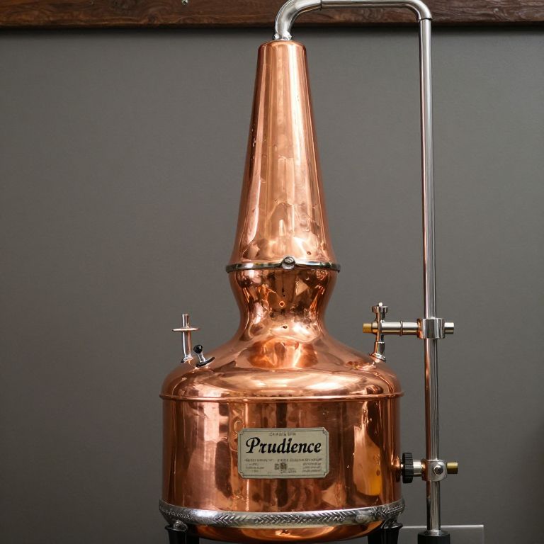 Copper-pot still labeled \"Prudence\" by Sipsmith, featuring a silver gauge and intricate details, stands prominently as the first licensed gin still in London since 1820, showcasing craftsmanship and heritage.