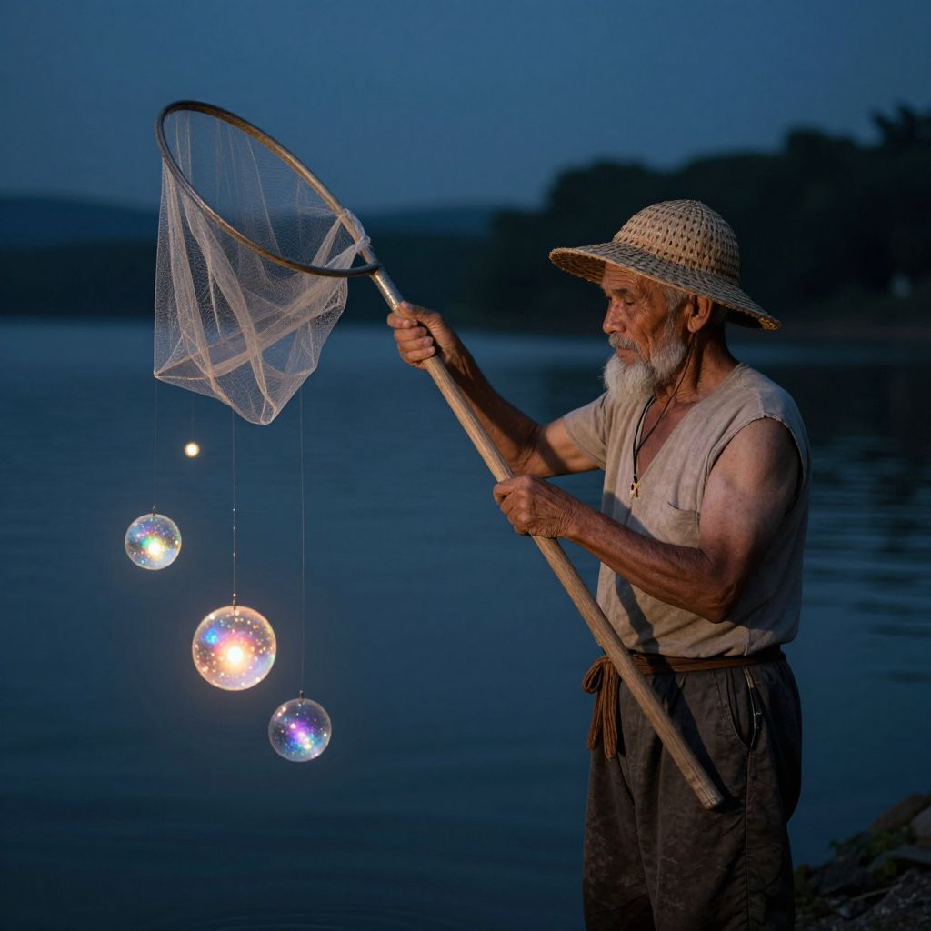 An elderly fisherman wields a magical net that ensnares shimmering orbs of light, each containing untold stories and forgotten dreams.