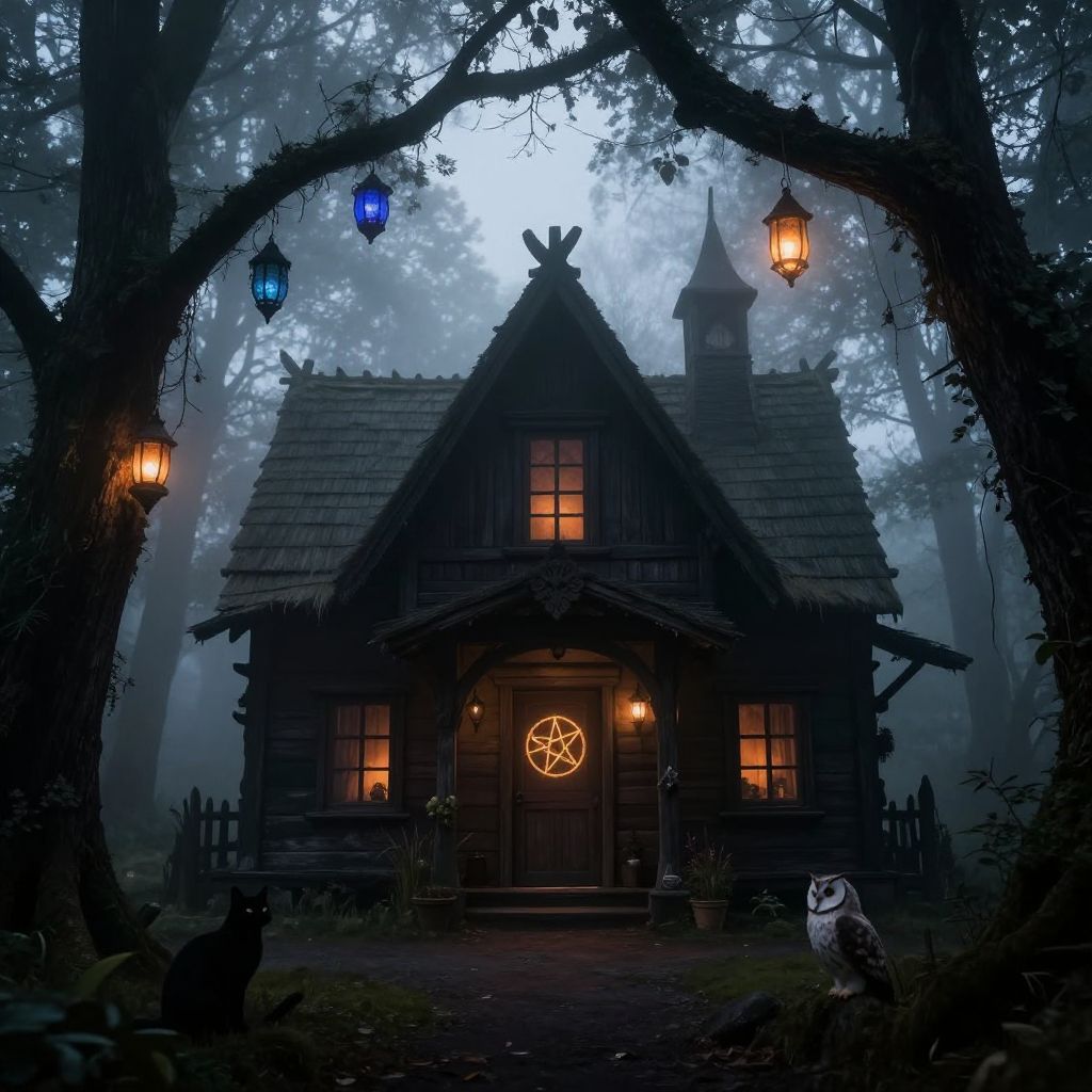 Witch cabin in the woods, old dark timber house enveloped in thick fog, with colorful lanterns hanging from the branches above, magical animals like black cats and owls nearby, a glowing pentagram on the door, evokes an atmosphere of ancient sorcery and mystery.