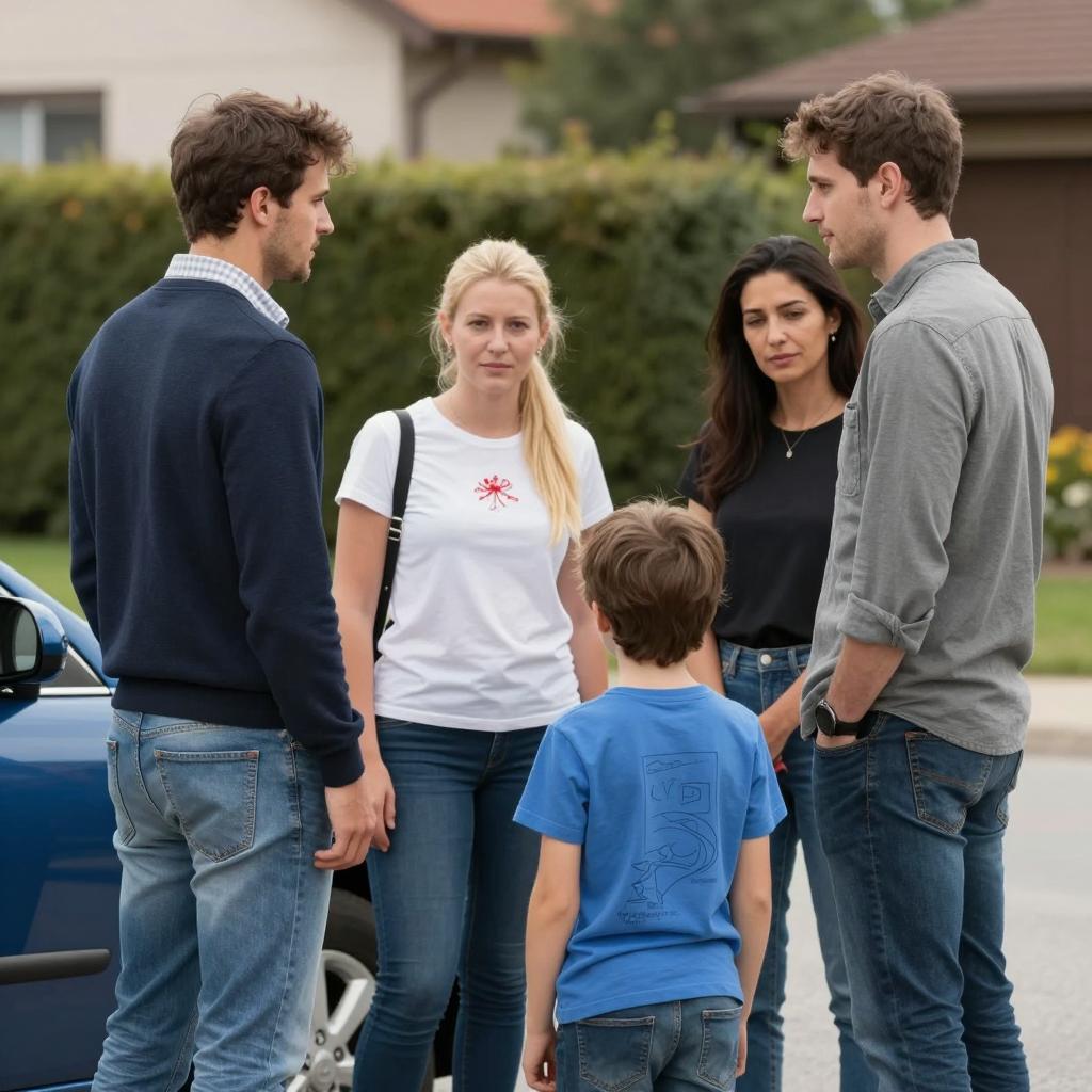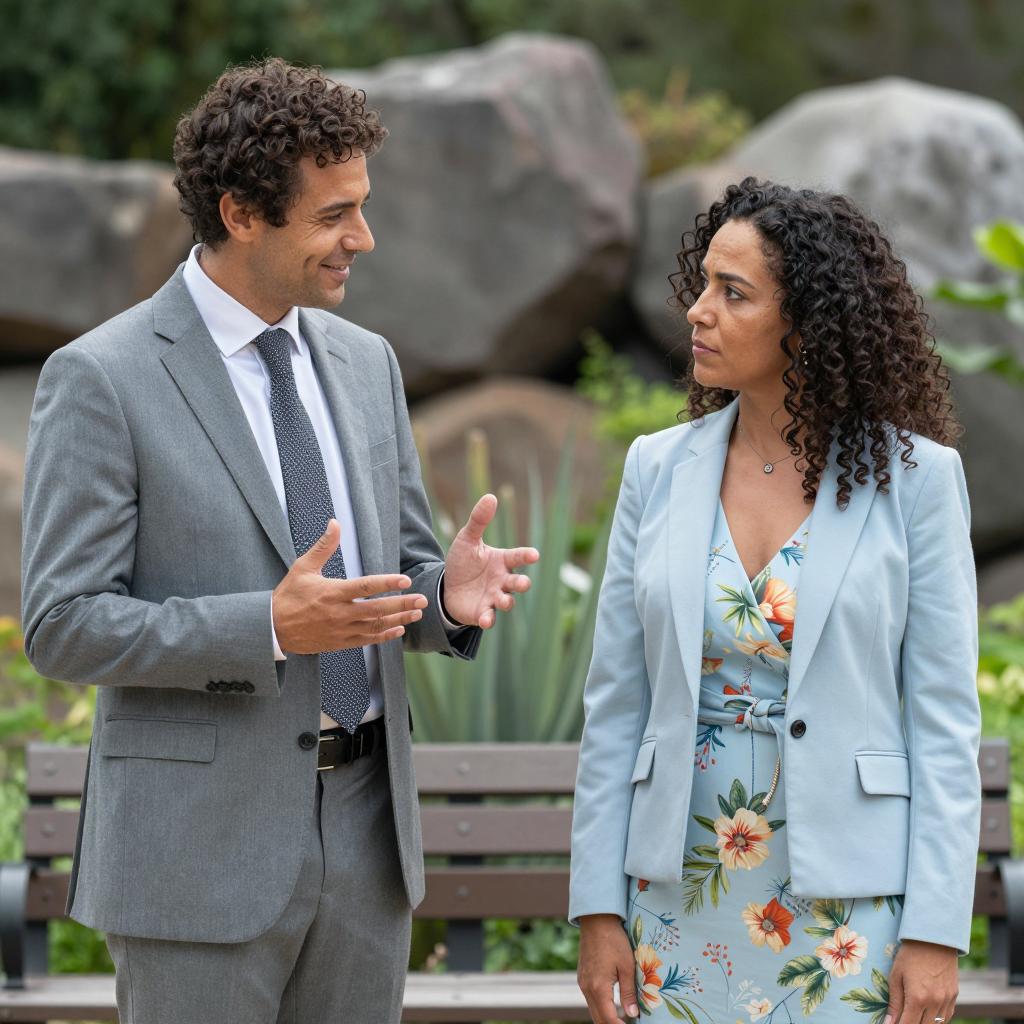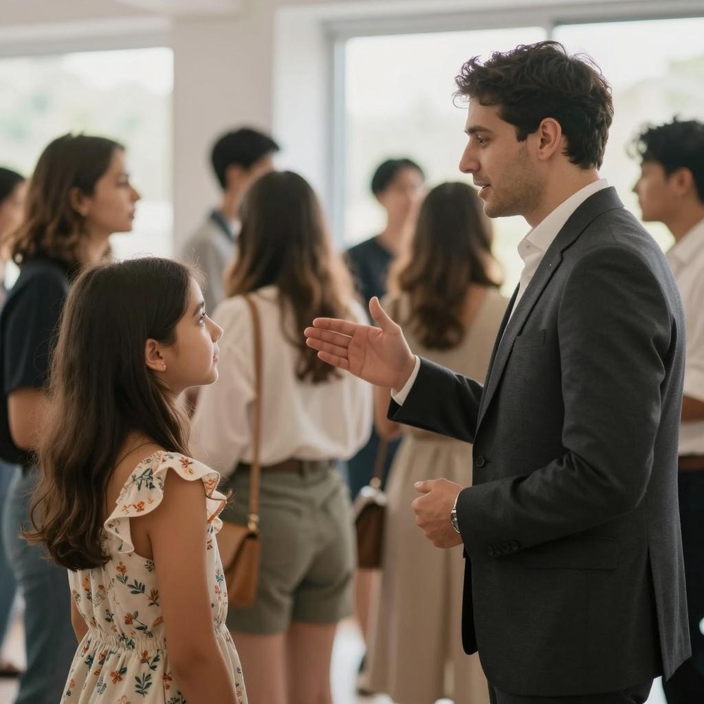 Photograph of a crowded indoor social event. A man with dark hair, wearing a dark gray suit and white shirt, stands to the right, gesturing with his right hand. A young girl with long dark hair, wearing a floral dress with ruffled sleeves, faces him. Multiple people in the background, some with backs turned, some partially visible. Bright natural light from windows.