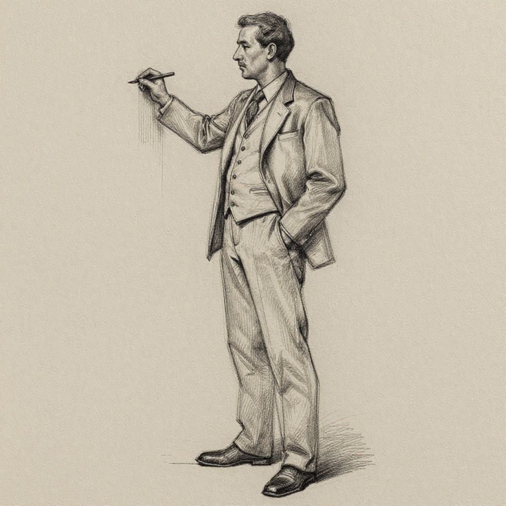 Black-and-white pencil drawing of a standing man in a three-piece suit, including a jacket, vest, and trousers, with a dress shirt and tie. He holds a cigar in his right hand, raised to his mouth, and has his left hand in his pocket. His hair is neatly combed, and he wears polished dress shoes. The background is plain white, emphasizing the detailed, textured lines of the suit and the man's confident, poised stance. The style is reminiscent of early 20th-century illustrations.