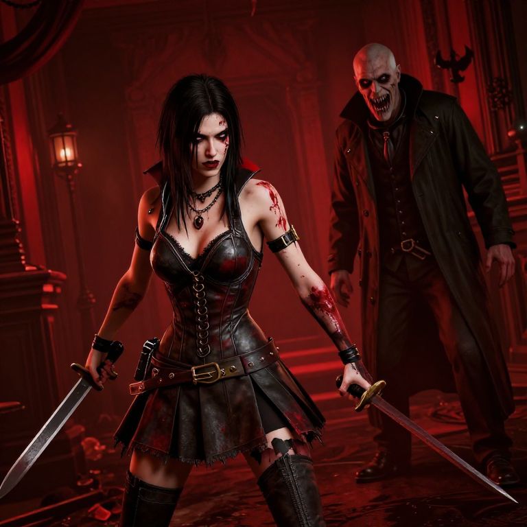 "Gritty brutal slasher 3D video game screenshot ,PS 5:3D vampire girl in defiant clothes, using wrist long blades tonfa vs old strong vampire, red colour, goth environment,"