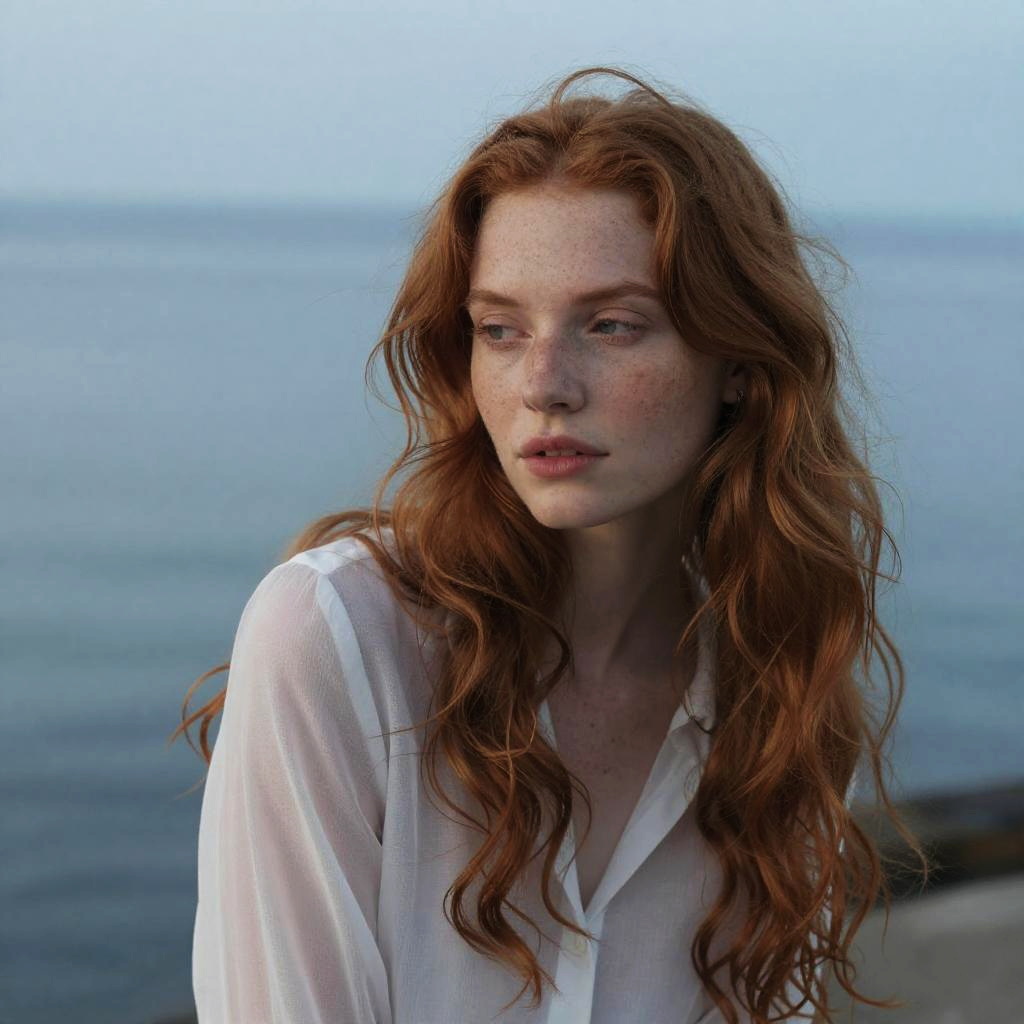 Photograph of a young, fair-skinned woman with long, wavy red hair, freckles across her face, and blue eyes. She is wearing a black top and has her right hand gently touching her hair. Her expression is neutral, with slightly parted lips. The background is a dark, textured stone wall with some sparse branches crossing the top. The image has a high-contrast, vivid color style, highlighting her red hair and freckles against the dark backdrop. The lighting is even, emphasizing her facial features.