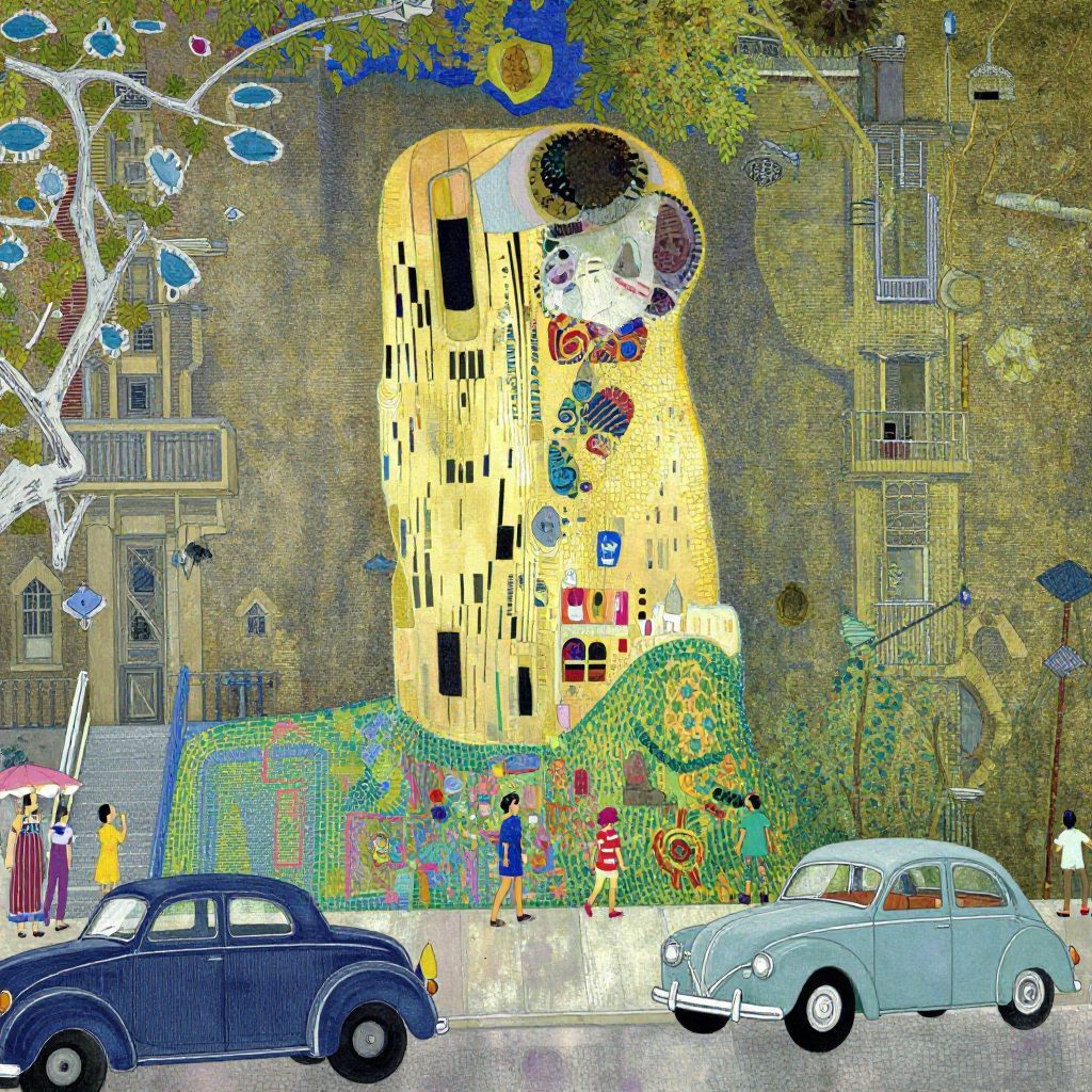 Vibrant digital illustration of Gustav Klimt's "The Tree of Life" on a city street with vintage cars, colorful flowers, and