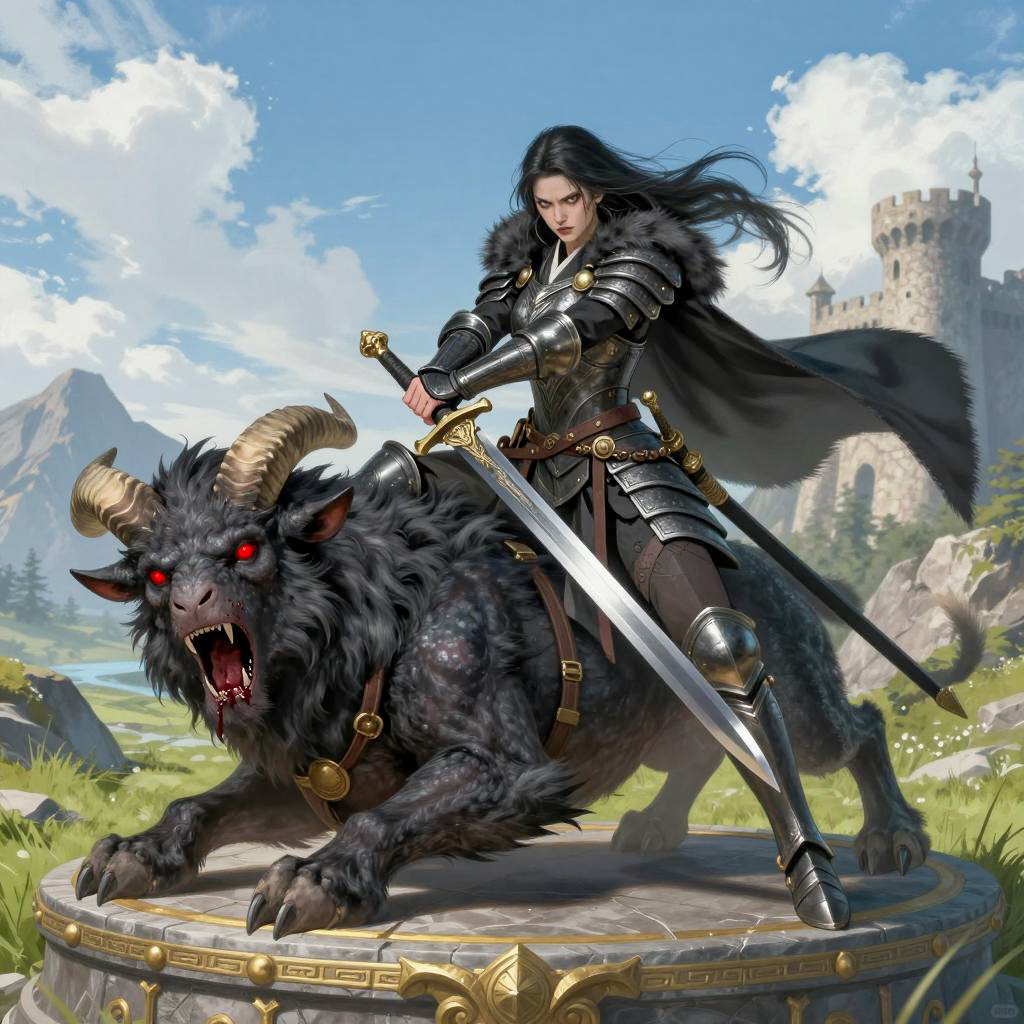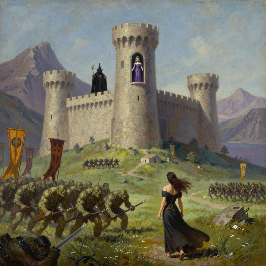Island 1960s fantasy painting, dark hair woman leading huge orc army to medieval evil fortress, army banners, evil mage, orc queen locked in tower, grassy plains, mountains in background, as painted by Basil Gogos,