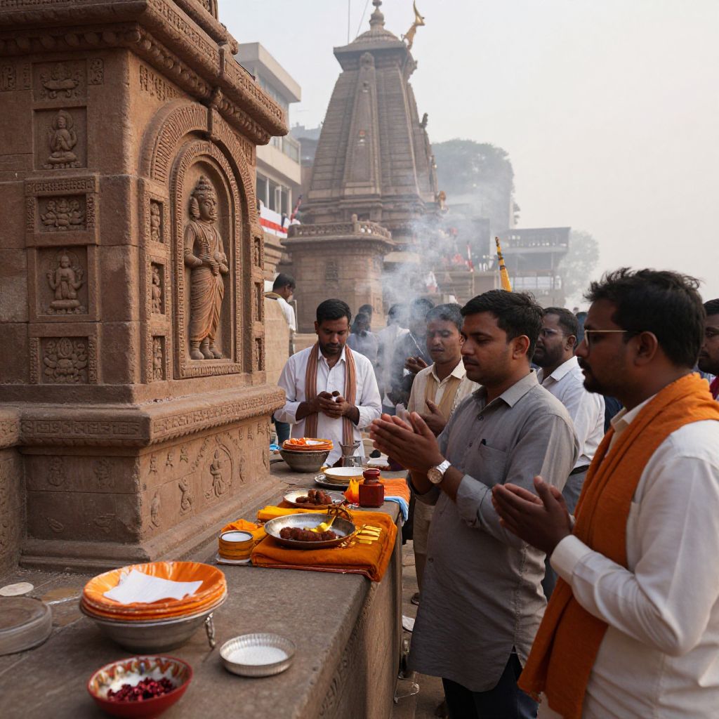 Indian men gathered around a temple in Varanasi, offering prayers, intricate carvings, sacred ghats, morning fog, spiritual ambiance, warm incense smoke, detailed facial expressions, rich Indian heritage.