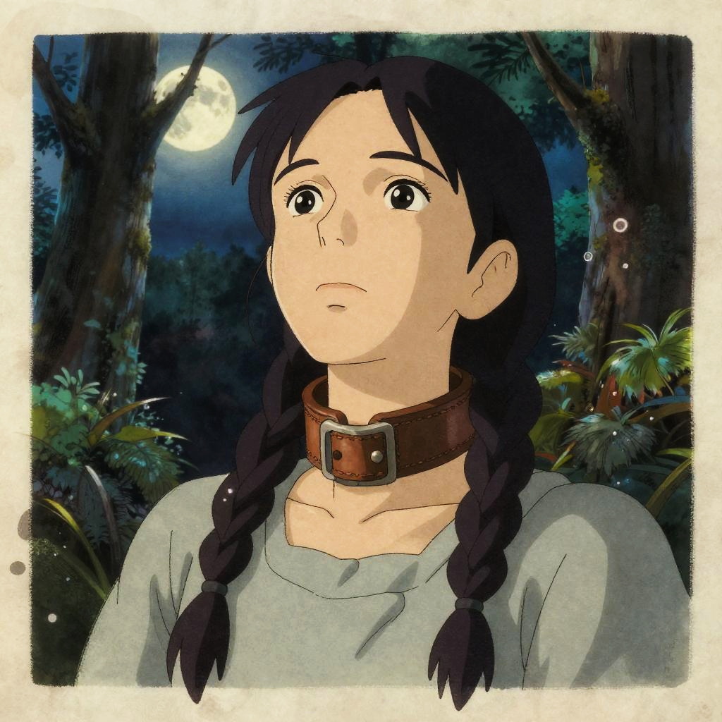 Realistic photo.on parchment, bemused to be locked in a leather neck restraint, Yuna in a full frame zoom up of her face and neck, looking upwards in a moonlit forest clearing, (complex artistic color ink pen sketch illustration:1.5), full detail, gentle shadowing, fully immersive reflections and particle effects, concept art by Artgerm and Range Murata and Studio Ghibli in collaboration. portrait of a beautiful woman by Greg Rutkowski, half body, black hair, braids, pale skin, realistic photo