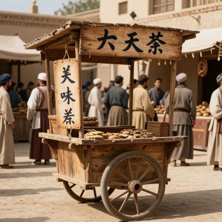 Photograph of a rustic wooden street cart with Chinese characters, selling bread in a bustling, sunlit marketplace with people in traditional attire.