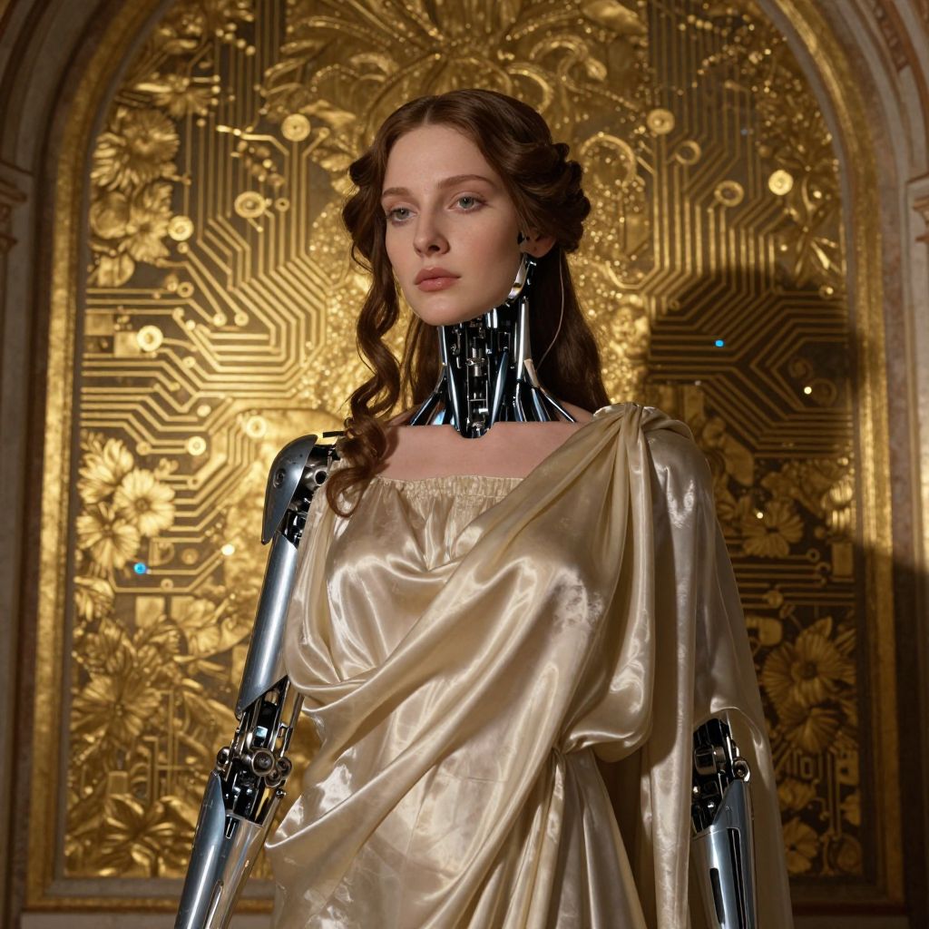 A mesmerizing blend of Renaissance grandeur and futuristic innovation, this image showcases an awe-inspiring portrait of a cyborg woman draped in ethereal silk robes, reminiscent of the classic works of renowned masters. The background reveals a stunning gold-leaf patterned mural that seamlessly integrates pulsating circuitry, merging the timeless beauty of ancient artistry with cutting-edge digital aesthetics. From an intriguing angle, her robotic components are subtly revealed beneath the delicate fabric, creating a harmonious fusion of organic and synthetic elements. Warm, golden light emanates from an unseen source, casting dramatic shadows across her visage and accentuating her enigmatic presence at the convergence of human craftsmanship and technological marvels.
