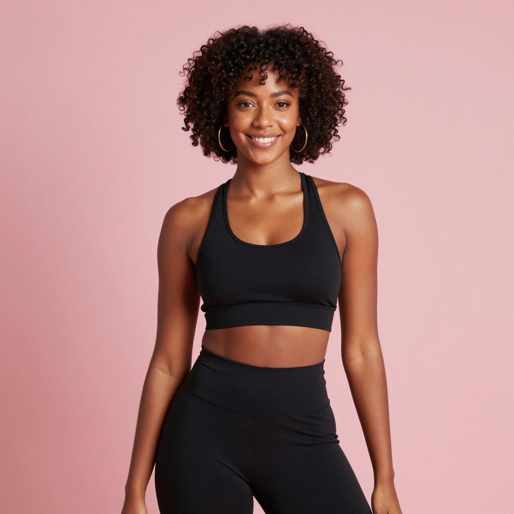 Portrait of an athletic young Black woman with tight curly hair wearing a black halter crop top and matching high-waisted leggings. She poses confidently against a soft pink studio background, wearing gold hoop earrings and displaying a well-toned physique.