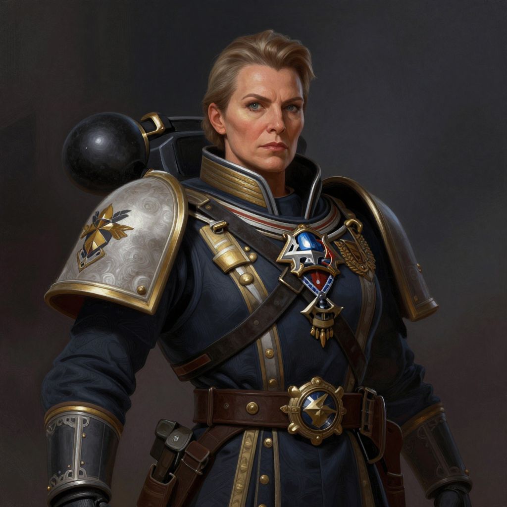 A detailed digital painting of a middle-aged woman in a grand officer's ceremonial tunic, featuring intricate monograms and warhammer 40,000 insignia, with broad shoulders and a strong, sturdy appearance, set against a dark, smoky background in the style of Ian McQue.