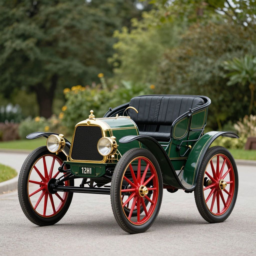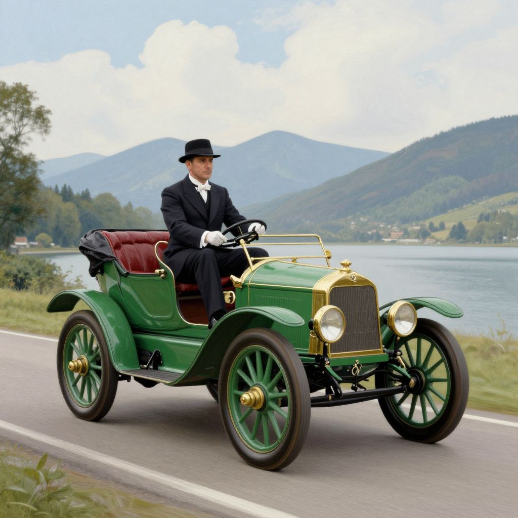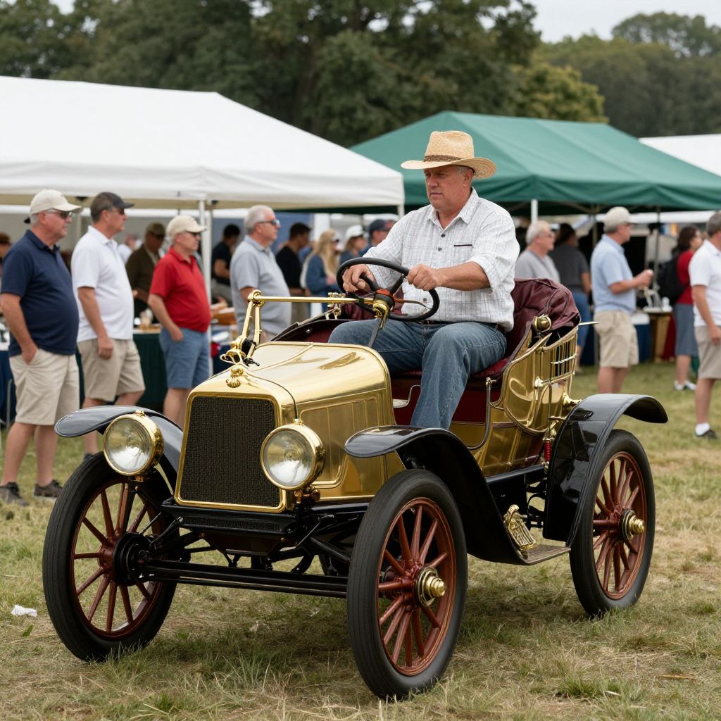 Vintage brass automobile showcased at the Brimfield Antique Show, featuring a man in a straw hat seated behind the steering wheel, surrounded by a lively crowd under white and green tents.