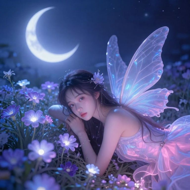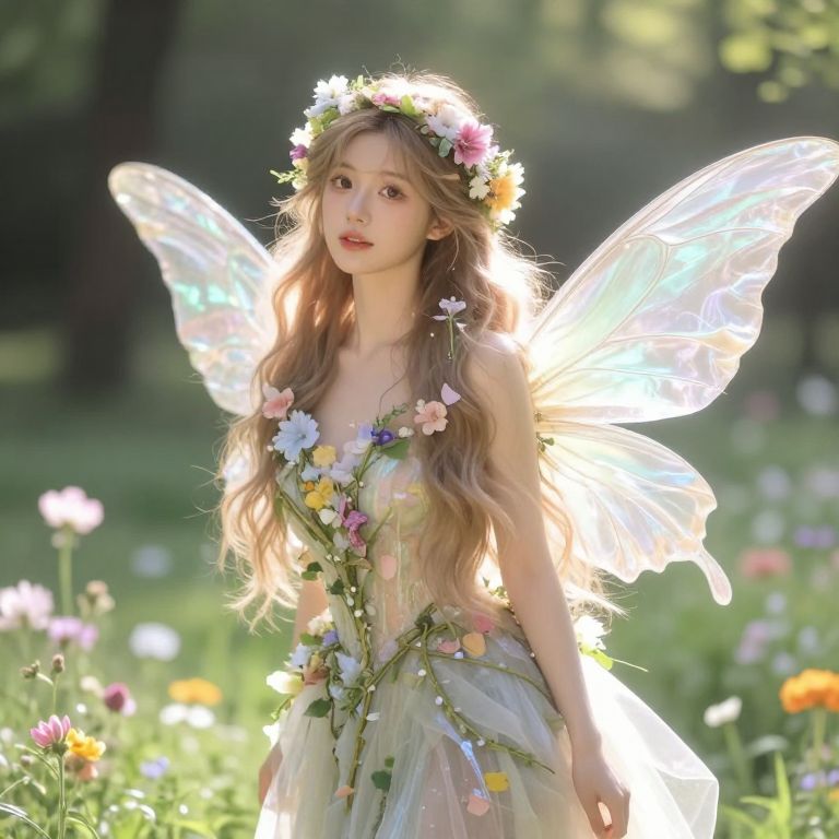An enchanting portrait showcasing an ethereal fairy queen with iridescent wings, reminiscent of stained glass in intricate design, gracefully descending upon a bed of vibrant, luminescent flowers. The aerial viewpoint highlights the mesmerizing interplay of light and color amidst the blossoms, as the celestial being's delicate features are illuminated by a warm sunset casting inviting hues across her translucent skin and flowing hair. This captivating image evokes a harmonious blend of wonder, serenity, and enchantment, inviting viewers to marvel at the fantastical beauty and ethereal allure of this fairy queen amidst her radiant garden sanctuary.