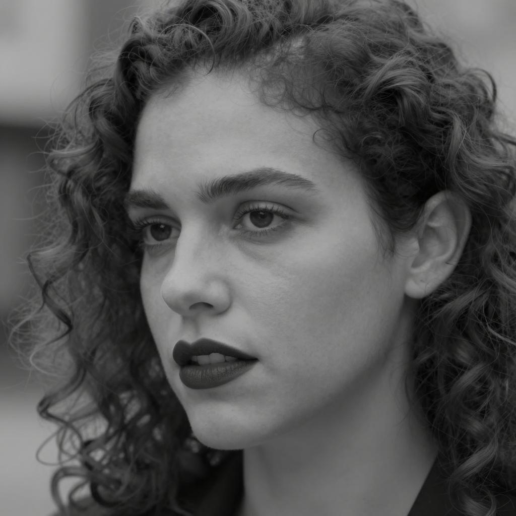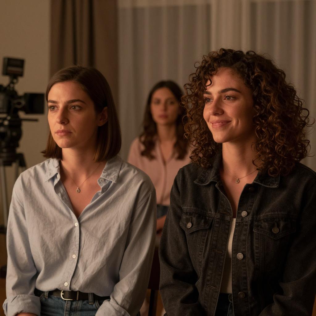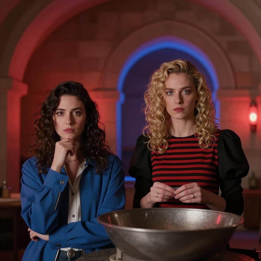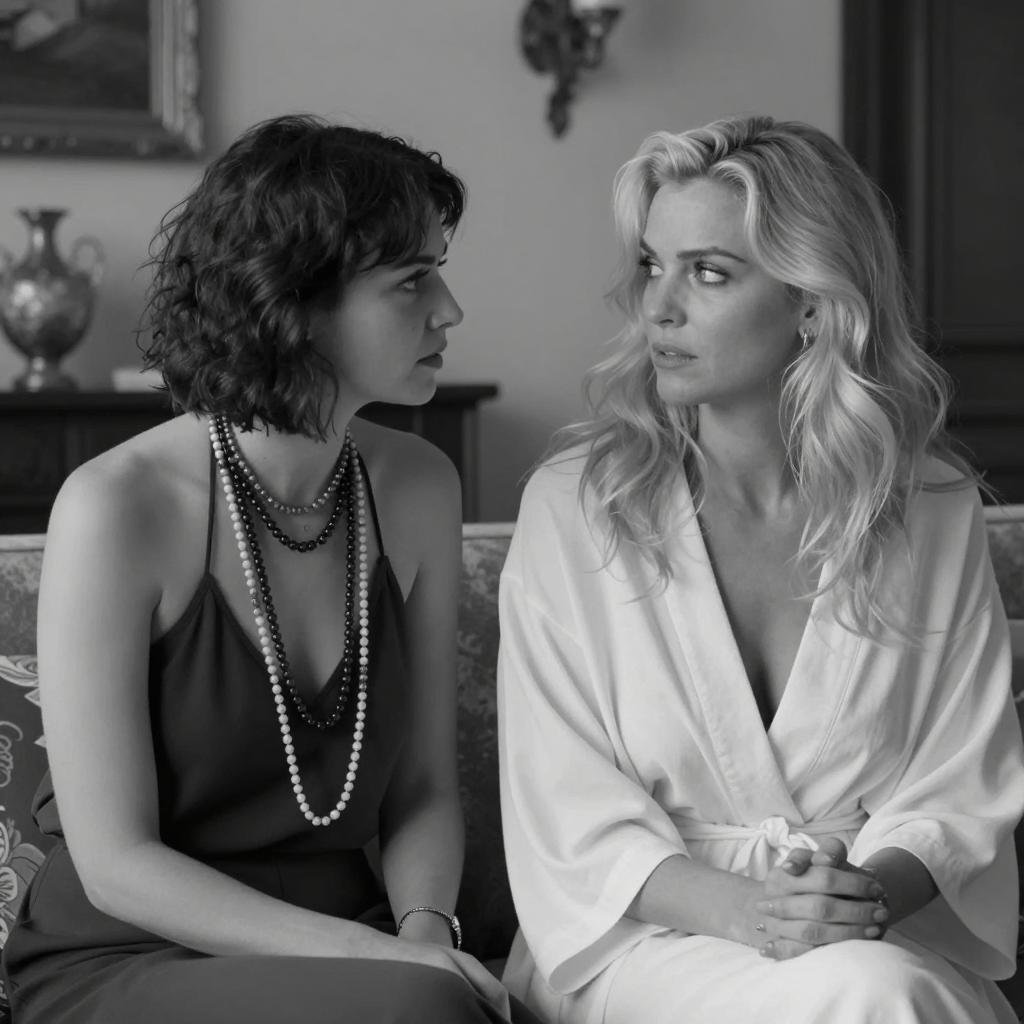 Black and white photograph of two women sitting on a couch. The woman on the left has dark curly hair, wears a polka dot dress with a white cardigan, and looks to the left. The woman on the right has blonde curly hair, wears a dark dress with a white collar, and rests her chin on her hand, looking to the right. Background includes framed pictures and a wooden wall.