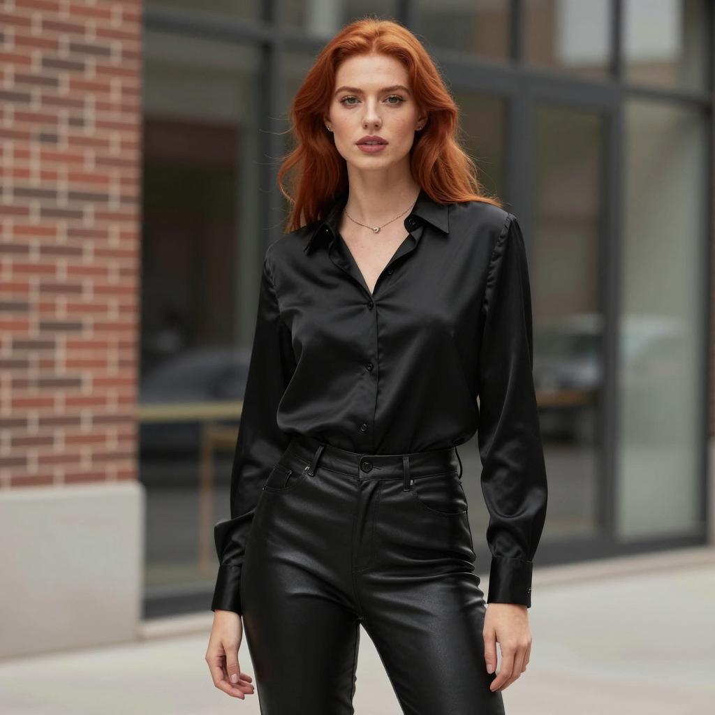 Woman fashion model wearing, photograph of a smiling woman with long red hair, standing outdoors on a paved path, wearing a white blazer, black top, white mini-skirt, brown knee-high leather boots with high heels, black gloves, green grass and trees in the background, evening light, confident pose, casual yet stylish, modern fashion, natural light, full body shot, realistic style, slight blur in the background, sunny day