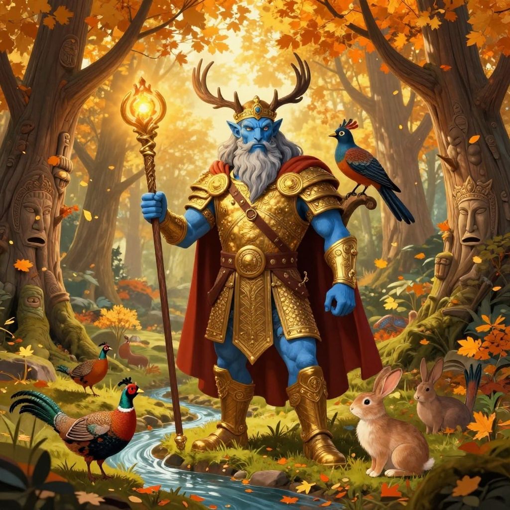 Illustration of Dagda, the mythological god of fertility, wisdom, and magic, depicted as a majestic blue-skinned figure with a long beard, ornate golden armor, and a crown of antlers. He holds a glowing staff and a bird perches on his arm. He stands beside a small stream in an enchanted autumn woodland, surrounded by pheasants and rabbits. The forest is flooded with golden sunlight filtering through vibrant orange and yellow fall leaves, with intricate tree carvings of faces and creatures in the background.