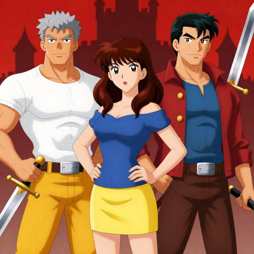 Digital animation of two muscular men with swords. Left man wears red headband, brown shirt, red gloves; right man wears blue and yellow armor, black gloves. Both have determined expressions. Background shows stone archway and wooden structures.