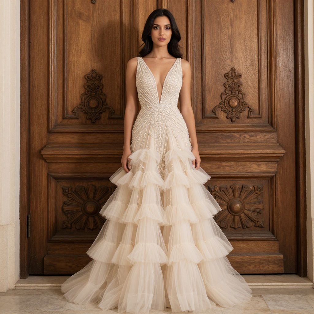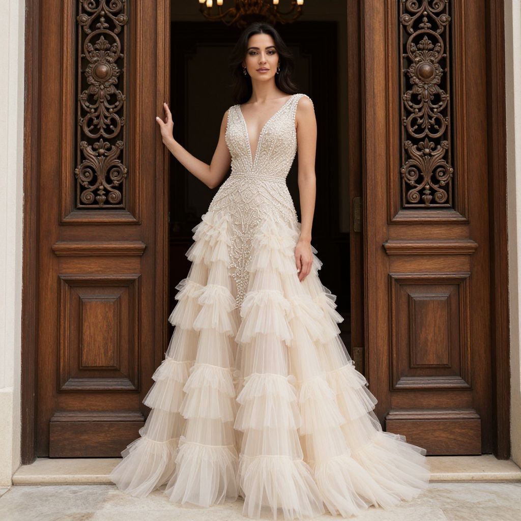 Elegant woman standing gracefully in front of ornate wooden doors, wearing a stunning cream-colored gown featuring intricate beadwork, a plunging neckline, and layered ruffled tulle skirt.