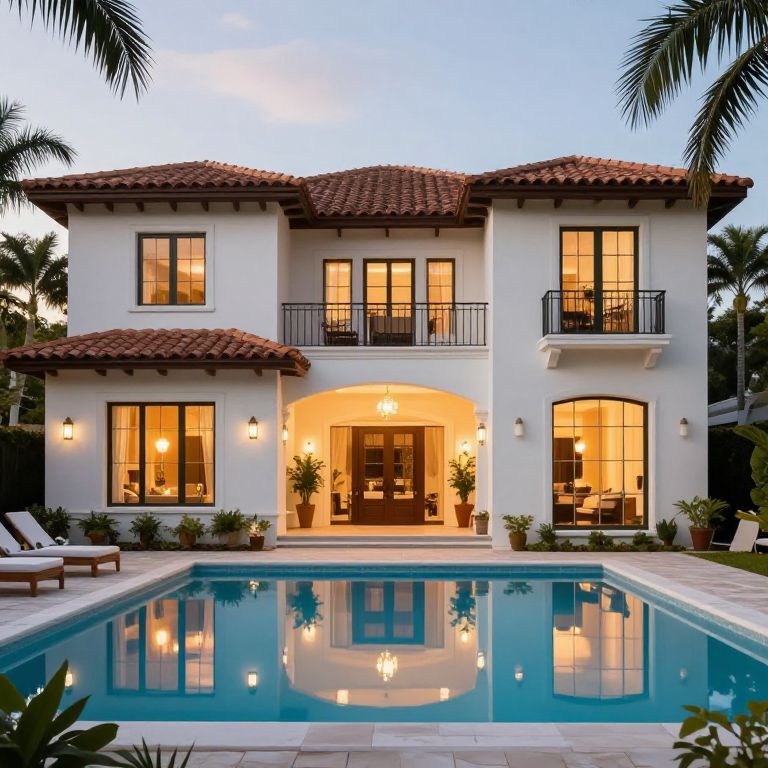 A luxurious Mediterranean-style home in Delray Beach, FL, features a stunning 3D-rendered exterior with warm, inviting lighting and a vibrant pool reflecting the serene ambiance, showcasing high-definition details and a seamless blend of natural and architectural beauty.