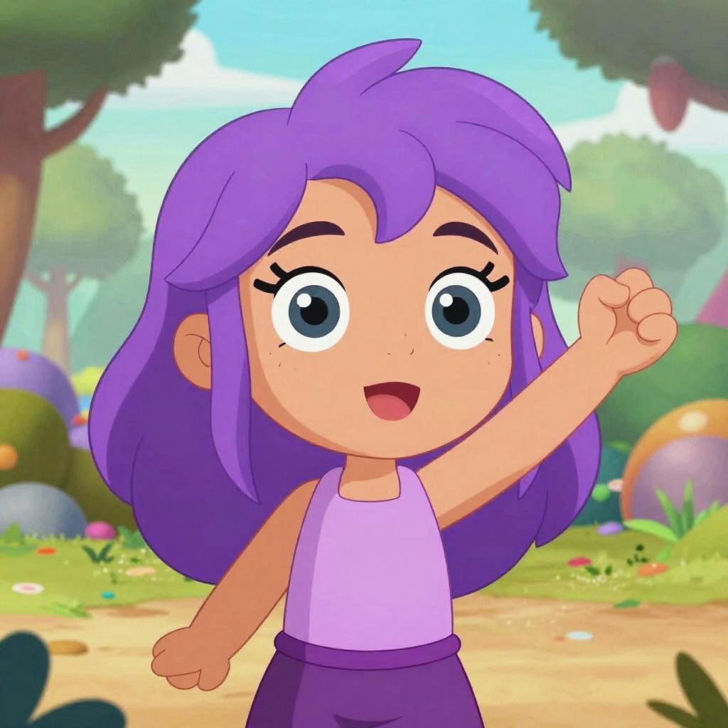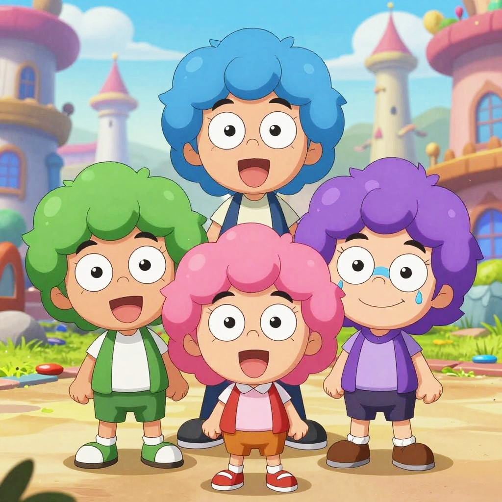 Cartoon characters with colored hair, standing in a fantasy cityscape, exaggerated expressions, bright hues of blue, pink, green, and purple, bold outlines, lively and fun atmosphere