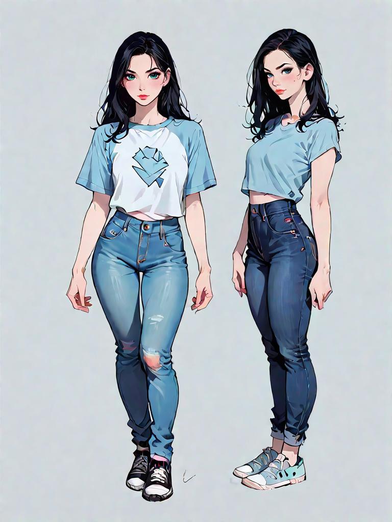 Digital illustration of a young woman with short black hair wearing a casual outfit. She is dressed in a black fitted t-shirt with graphic print, paired with light blue ripped skinny jeans and black sneakers. The woman accessorizes with bracelets and features large round sunglasses in one depiction. The illustration highlights both a full body view and upper body close-up, emphasizing modern casual fashion.