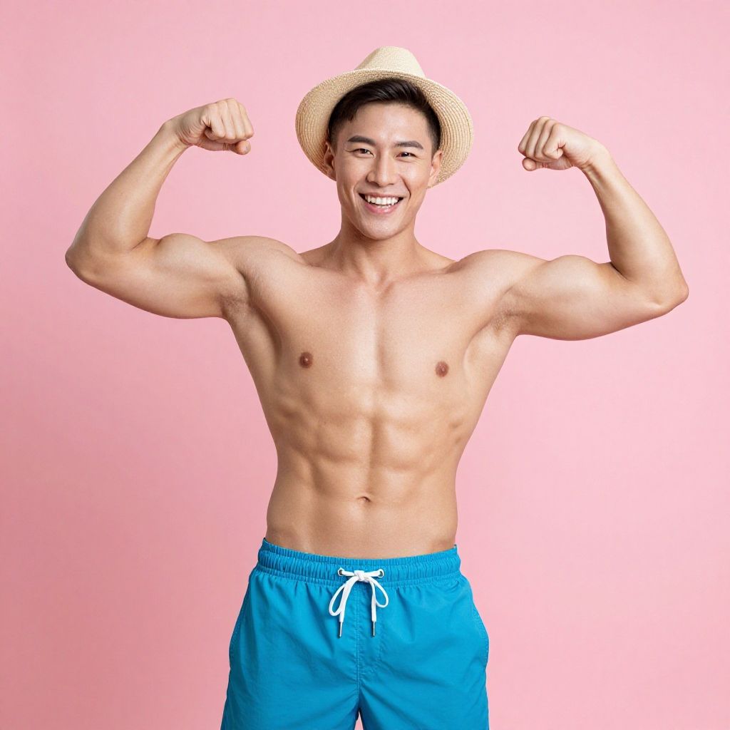 Photograph of a young Asian male with a medium build, standing against a solid pink background. He is shirtless, showcasing a well-defined, muscular physique with visible abs. He is smiling broadly, showing white teeth, and wearing a straw hat. His arms are flexed to display his biceps, and he is dressed in bright blue swim trunks with a white drawstring. The lighting is bright, highlighting his smooth, tan skin. His short black hair is slightly tousled under the hat. The overall style is vibrant and cheerful, emphasizing his fit appearance and confident demeanor.