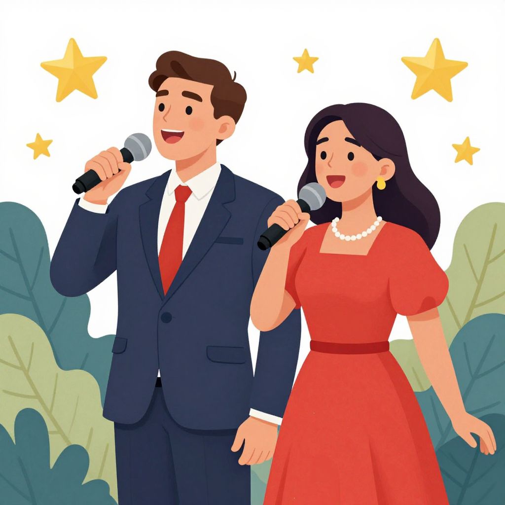This digital illustration depicts a cheerful couple performing on stage. The woman, with long black hair and fair skin, wears a vibrant red, V-neck dress with short sleeves, and holds a microphone to her mouth while smiling. The man, with short brown hair and fair skin, wears a dark navy suit with a white shirt and holds a microphone as well. Both have black eyes and small, smiling mouths. They stand against a simple white background with green foliage and yellow stars, adding a celebratory feel. The style is colorful and cartoonish, with bold outlines and flat colors.